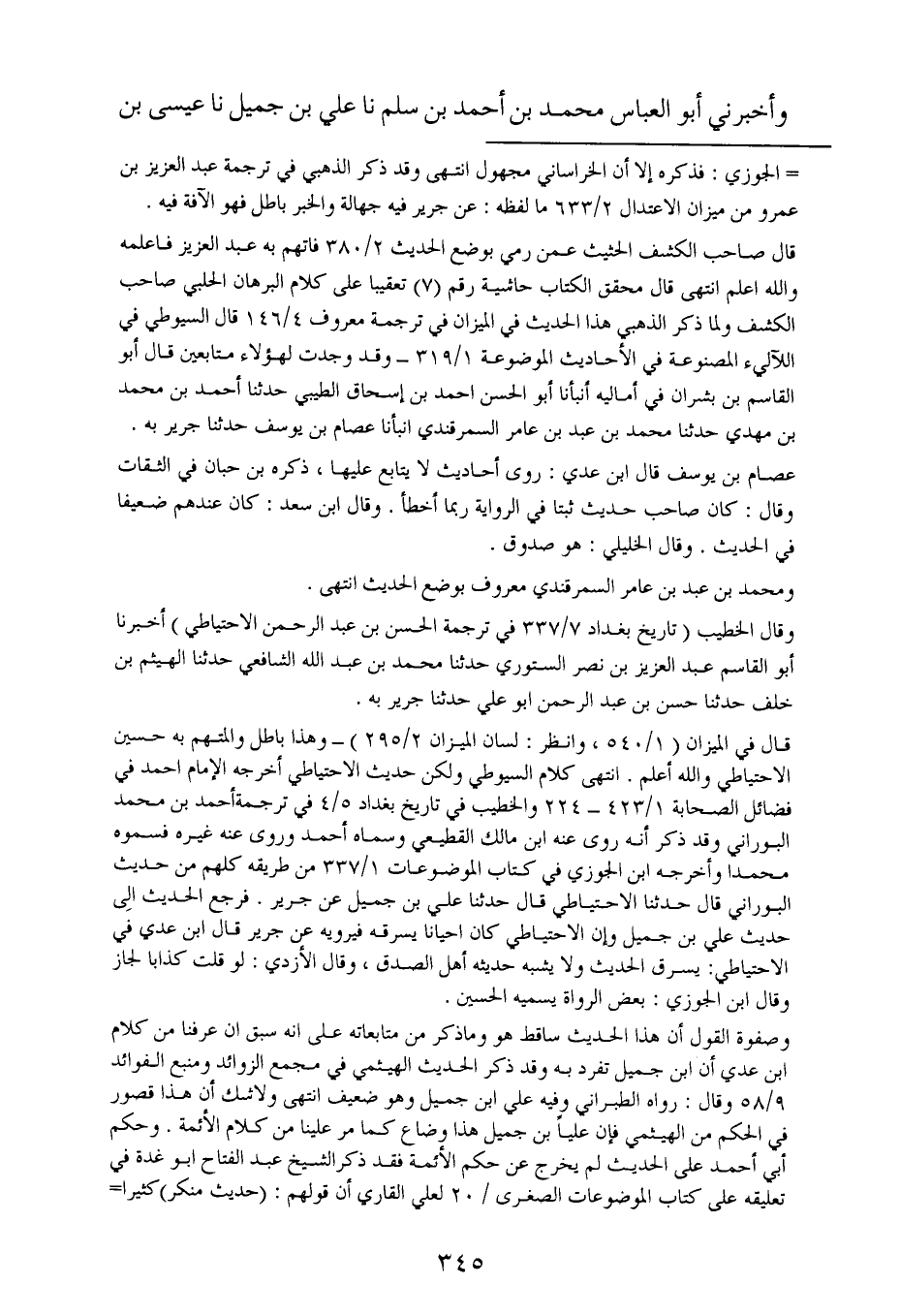 أخبرني أبو العباس محمد بن أحمد بن سلم الرقي بحران ، حَدَّثنا علي بن جميل ، حَدَّثنا جرير بن عبد الحميد الضبي من ضبة الكوفة عن ليث بن أبي سليم عن مجاهد عن ابن عباس عن النبي صلى الله عليه وسلم قال : إن في الجنة شجرة أو ما في الجنة شجرة – شك علي – عليها ورقة إلا على كل ورقة مكتوب لا إله إلا الله محمد رسول الله أبو بكر الصديق الفاروق عُمَر الفاروق عثمان ذو النورين.