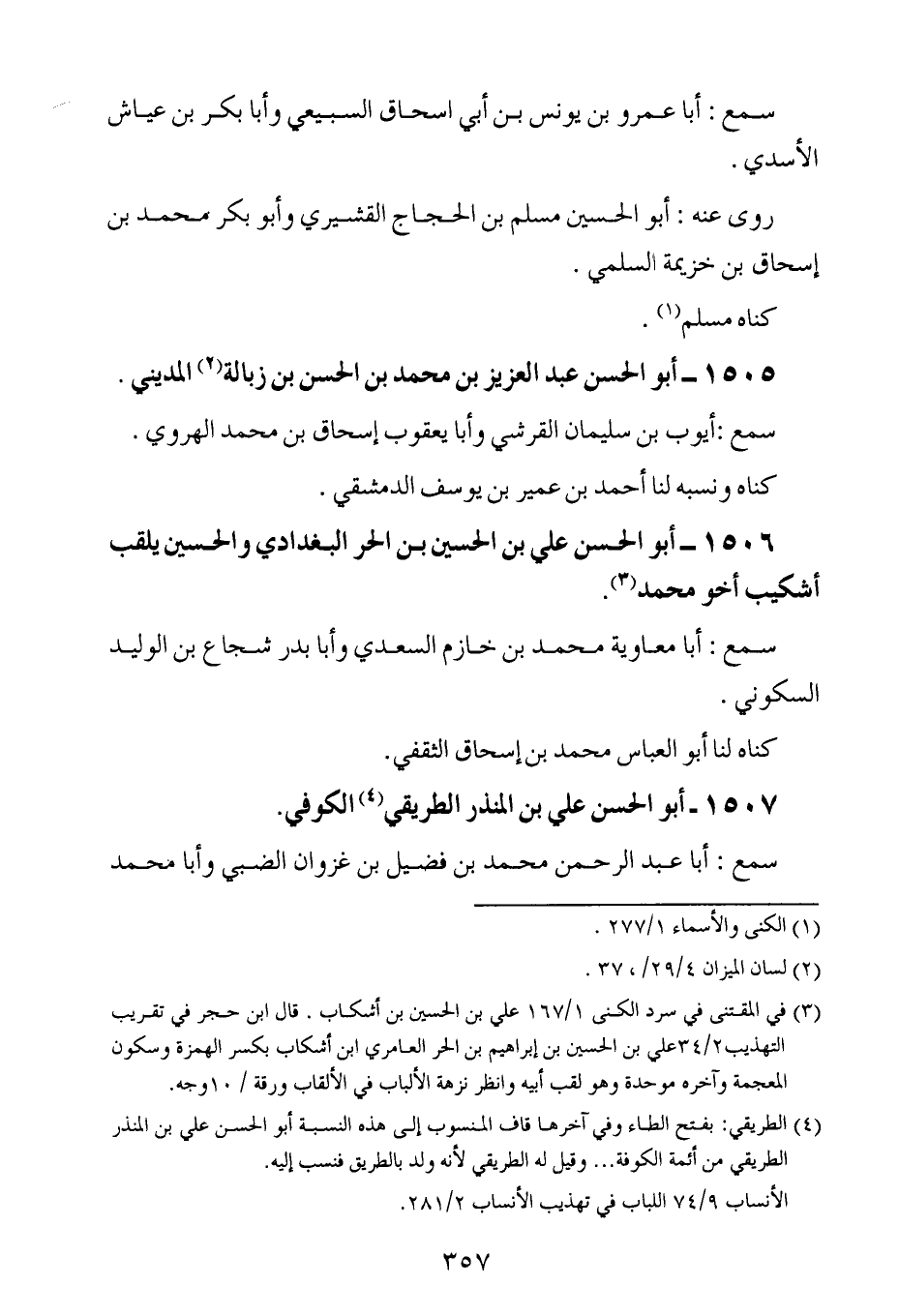 1506- أبو الحسن علي بن الحسين بن الحر البغدادي والحسين يلقب أشكيب أخو محمد.