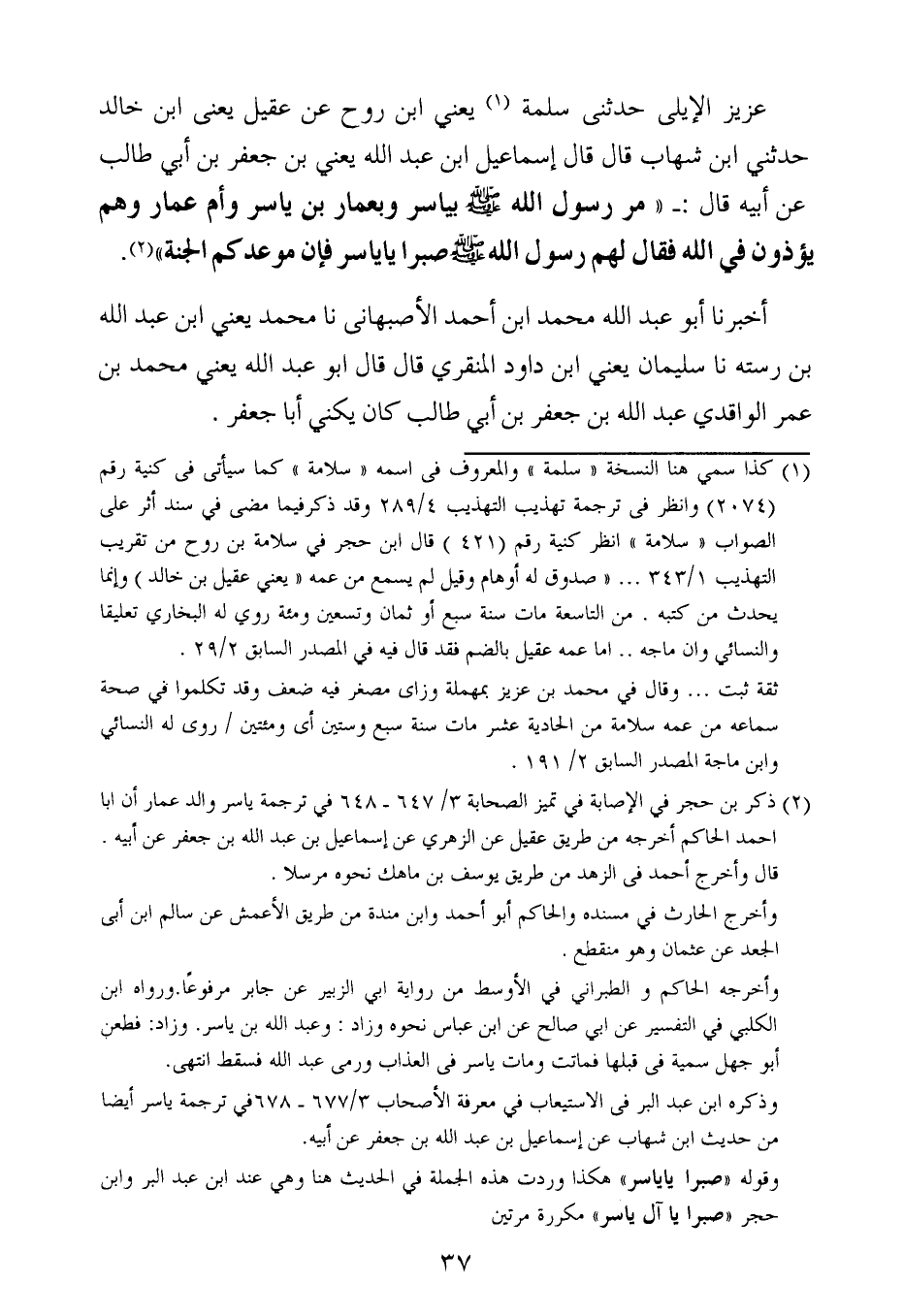 أَخْبَرنا أبو محمد عبد الرحمن بن محمد بن إدريس الحنظلي ، حَدَّثنا محمد ، يَعنِي ابن عزيز الإيلي حدثني سلمة ، يَعنِي ابن روح عن عقيل ، يَعنِي ابن خالد حدثني ابن شهاب ، قال : قال إسماعيل بن عبد الله ، يَعني ابن جعفر بن أبي طالب ، عَن أبيه قال : مر رسول الله صلى الله عليه وسلم بياسر وبعمار بن ياسر وأم عمار وهم يؤذون في الله فقال لهم رسول الله صلى الله عليه وسلم صبرا ياياسر فإن موعدكم الجنة.