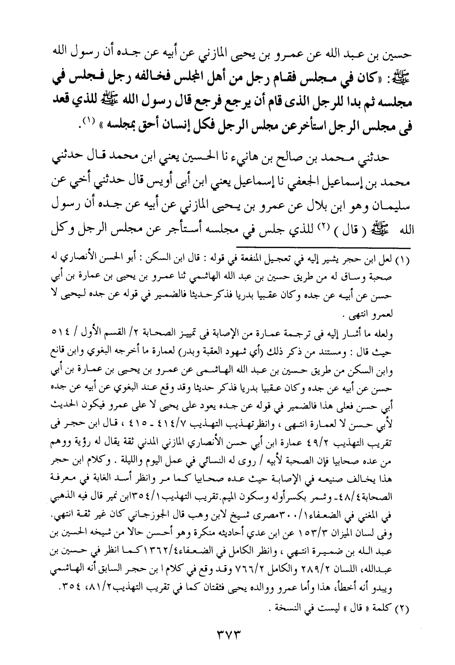 حدثني محمد بن صالح بن هانِئ ، حَدَّثنا الحسين ، يَعنِي ابن محمد ، قال : حَدَّثني محمد بن إسماعيل الجعفي ، حَدَّثنا إسماعيل ، يَعنِي ابن أبي أويس ، قال : حَدَّثني أخي عن سُليمان ، وَهُو ابن بلال عن عَمْرو بن يحيى المازني ، عَن أبيه ، عَن جَدِّه أن رسول الله صلى الله عليه وسلم قال للذي جلس في مجلسه أستأخر عن مجلس الرجل وكل إنسان أحق بمجلسه.