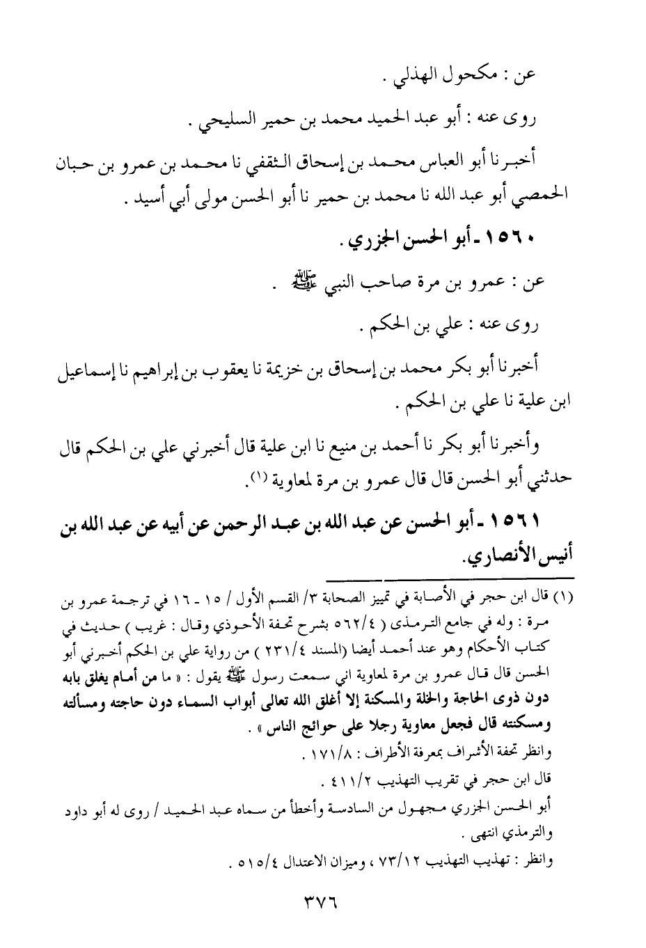 وأخبرنا أبو بكر ، حَدَّثنا أحمد بن منيع ، حَدَّثنا ابن علية قال أخبرني علي بن الحكم ، قال : حَدَّثني أبو الحسن ، قال : قال عَمْرو بن مرة لمعاوية.