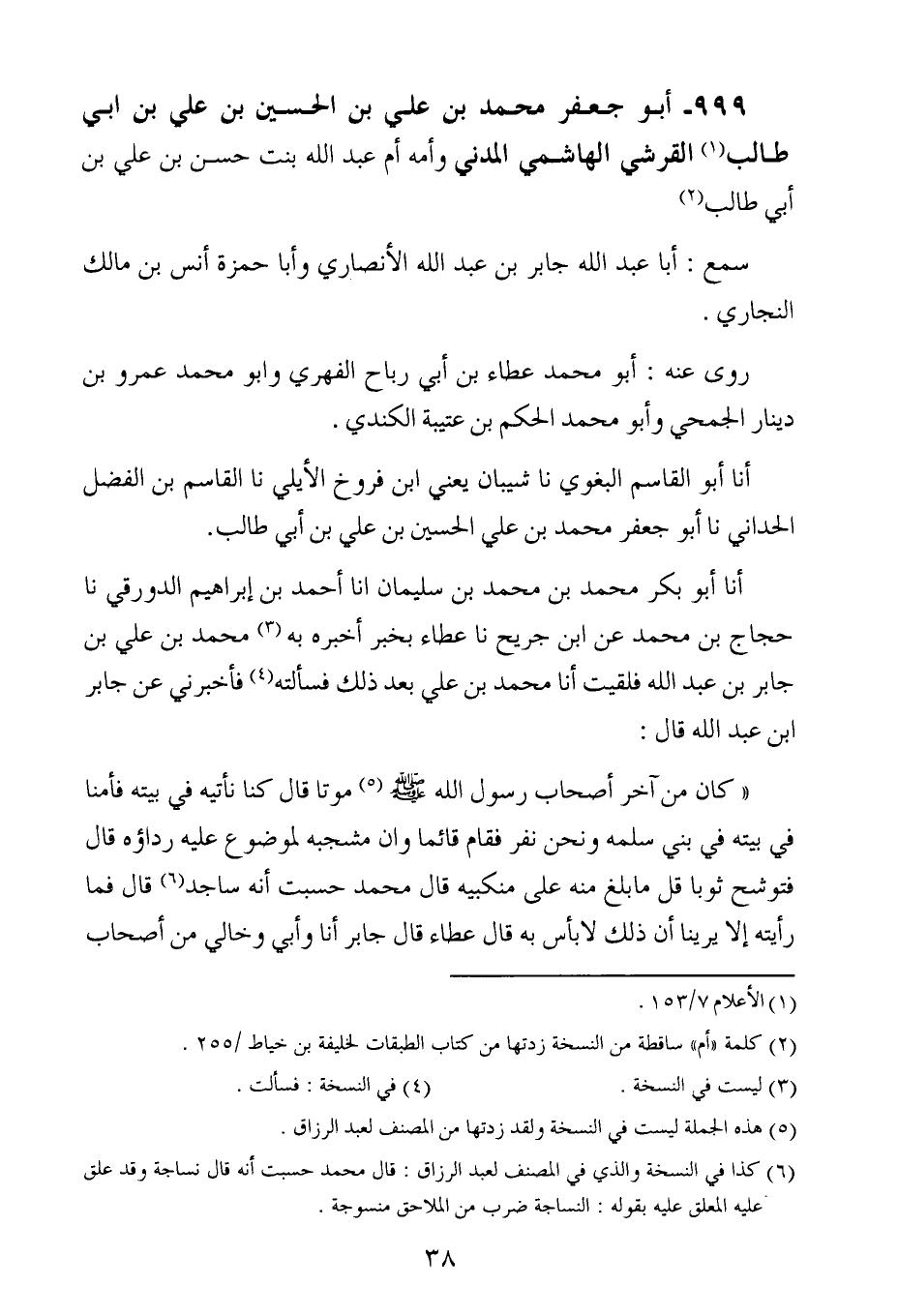 999- أبو جعفر محمد بن علي بن الحسين بن علي بن أبي طالب القرشي الهاشمي المدني وأمه أم عبد الله بنت حسن بن علي بن أبي طالب.