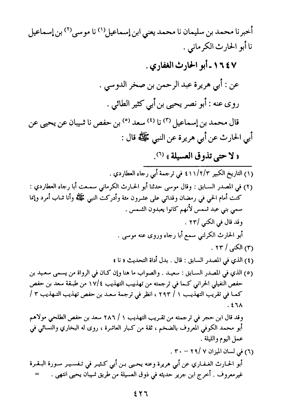 قال محمد بن إسماعيل ، حَدَّثنا سعد بن حفص ، حَدَّثنا شيبان عن يحيى عن أبي الحارث عن أبي هريرة عن النبي صلى الله عليه وسلم قال : لا حتى تذوق العسيلة.