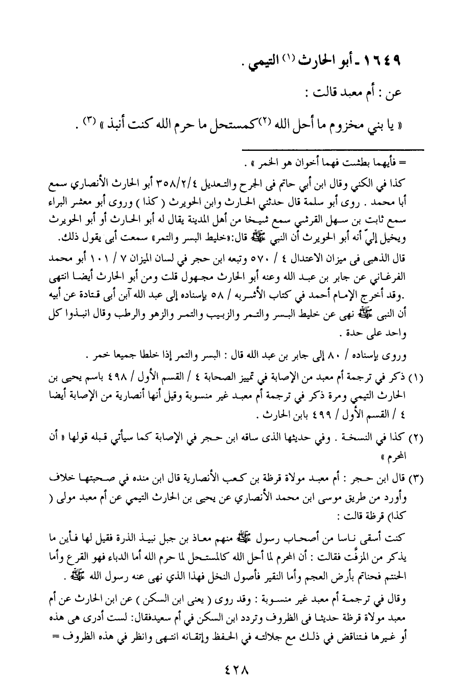 عن أم معبد قالت : يابني مخزوم ما أحل الله كمستحل ما حرم الله كنت أنبذ.