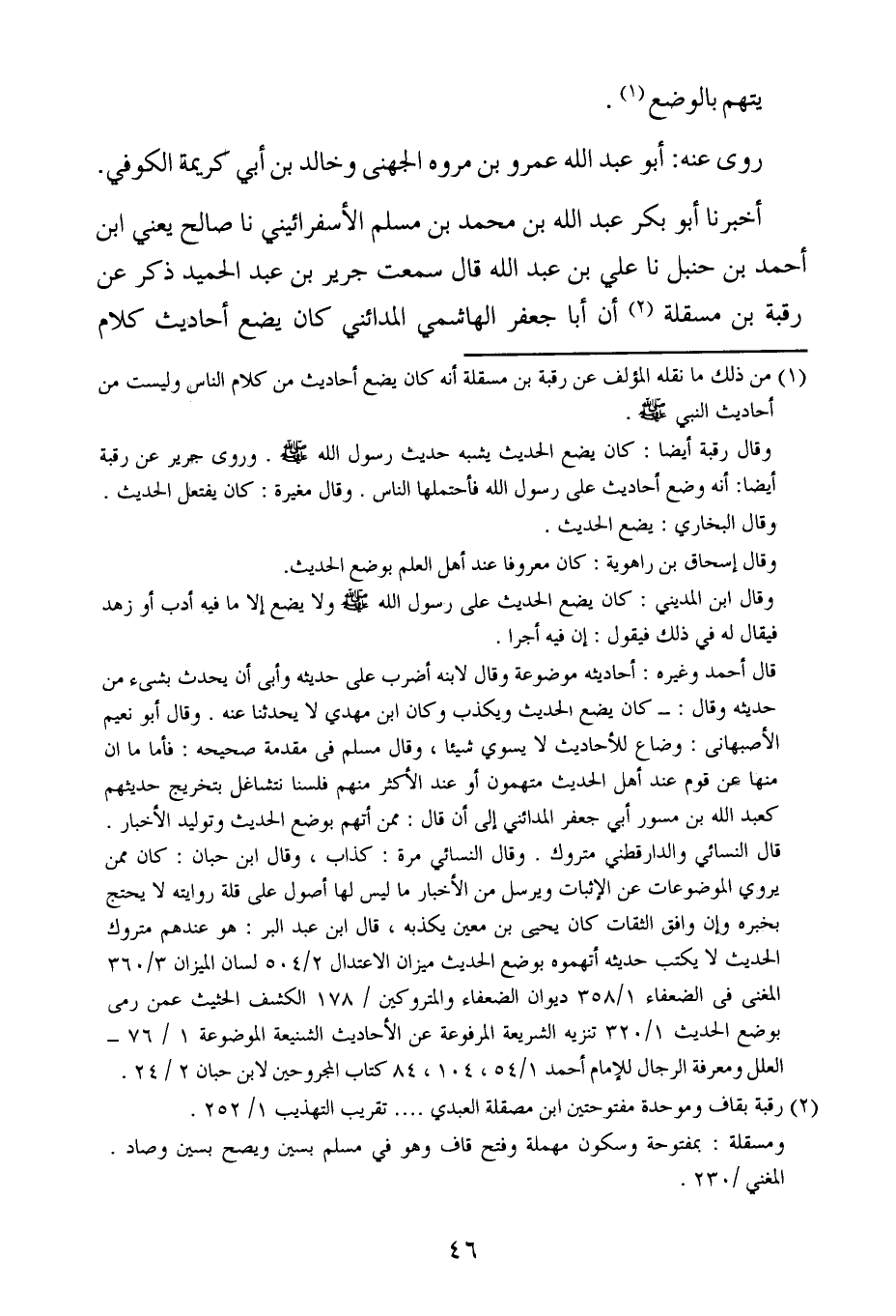 أخبرنا أبو بكر عبد الله بن محمد بن مسلم الأسفرائيني ، حَدَّثنا صالح ، يَعنِي ابن أحمد بن حنبل ، حَدَّثنا علي بن عبد الله ، قال : سَمِعتُ جرير بن عبد الحميد ذكر عن رقبة بن مسقلة أن أبا جعفر الهاشمي المدائني كان يضع أحاديث كلام وليست من أحاديث النبي صلى الله عليه وسلم.
