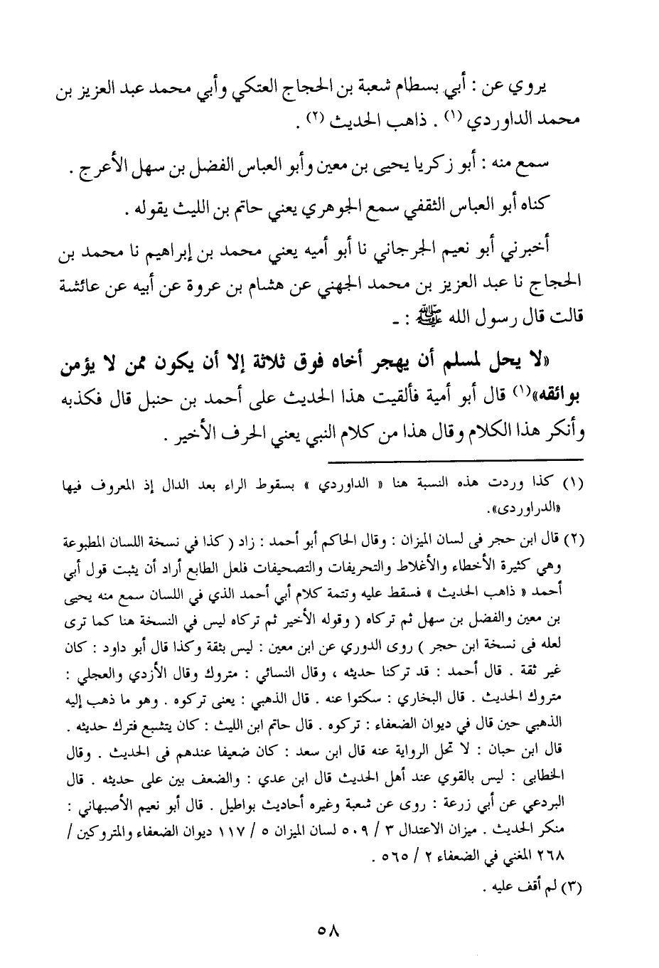 أخبرني أبو نعيم الجرجاني ، حَدَّثنا أبو أمية ، يَعني محمد بن إبراهيم ، حَدَّثنا محمد بن الحجاج ، حَدَّثنا عبد العزيز بن محمد الجهني عن هشام بن عروة ، عَن أبيه عن عائشة قالت قال رسول الله صلى الله عليه وسلم : لا يحل لمسلم أن يهجر أخاه فوق ثلاثة إلا أن يكون ممن لا يؤمن بوائقه قال أبو أمية فألقيت هذا الحديث على أحمد بن حنبل قال فكذبه وأنكر هذا الكلام وقال هذا من كلام النبي ، يَعني الحرف الأخير.
