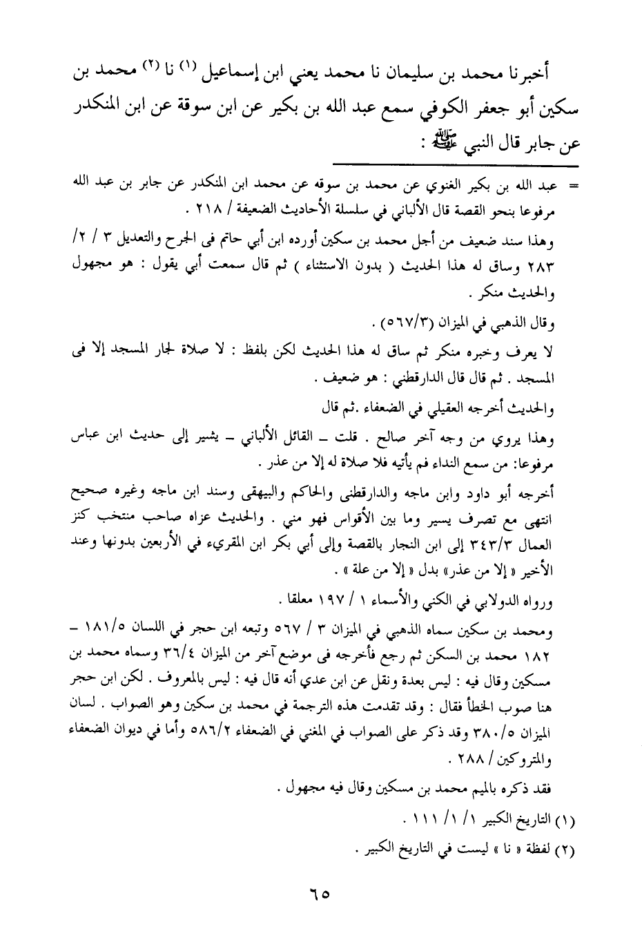 أَخْبَرنا أبو محمد يحيى بن محمد بن صاعد ، حَدَّثنا زكريا بن يحيى أبو السكين الطائي ، قال : حَدَّثني محمد بن السكين مؤذن بني شقرة من بني ضبة بالكوفة قال : حدثني عبد الله بن بكير الغنوي عن محمد بن سوقة عن محمد بن المنكدر عن جابر بن عبد الله قال : تخلف قوم عن صلاة العشاء الآخرة فقال لهم رسول الله صلى الله عليه وسلم ما خلفكم عن الصلاة ؟ قال فسكتوا فأعاد عليهم فقالوا يارسول الله وقع بيننا كلام فقال رسول الله : لا صلاة لمن سمع النداء ثم لم يأته إلا من علة.