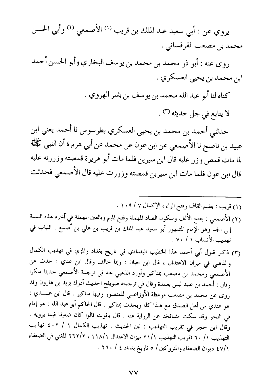 حدثني أحمد بن محمد بن يحيى العسكري بطرسوس ، حَدَّثنا أحمد ، يَعنِي ابن عبيد بن ناصح ، حَدَّثنا الأصمعي عن ابن عون عن محمد عن أبي هريرة أن النبي صلى الله عليه وسلم لما مات قمص وزر عليه قال ابن سيرين فلما مات أبو هريرة قمصته وزررته عليه قال ابن عون فلما مات ابن سيرين قمصته وزررت عليه قال الأصمعي فحدثت به حماد بن زيد فقال أنا زررت على ابن عون.