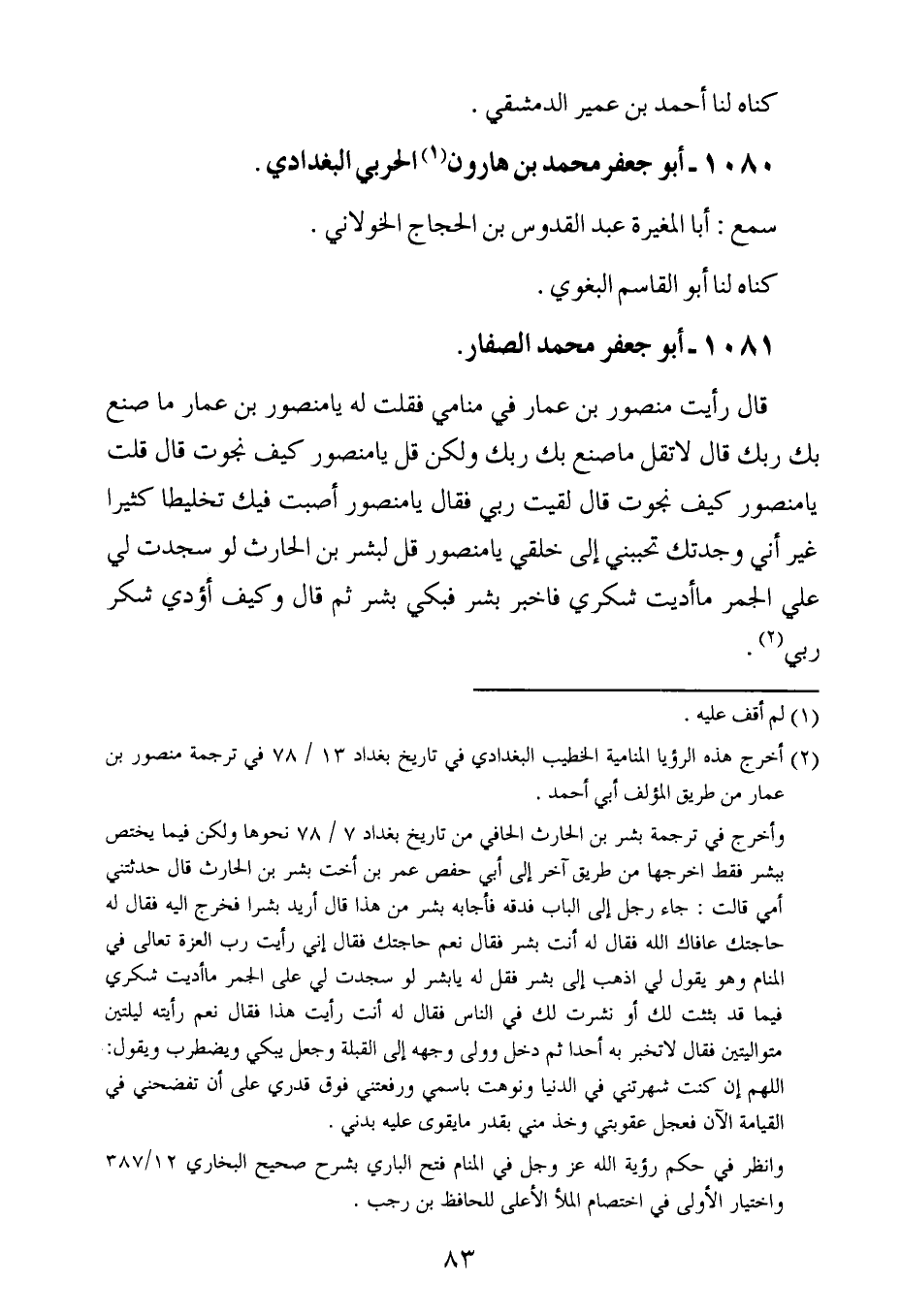 قال رأيت منصور بن عمار في منامي فقلت له يامنصور بن عمار ما صنع بك بك قال لا تقل ما صنع بك بك ولكن قل يامنصور كيف نجوت قال قلت يامنصور كيف نجوت قال لقيت ربي فقال يامنصور أصبت فيك تخليطا كثيرا غير أني وجدتك تحببني إلى خلقي يامنصور قل لبشر بن الحارث لو سجدت لي على الجمر ما أديت شكري فاخبر بشر فبكى بشر ثم قال وكيف أؤدي شكر ربي.