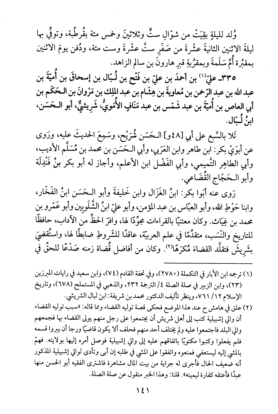 335 - عليّ (¬1) بن أحمدَ بن عليّ بن فَتْح بن لُبّال بن إسحاقَ بن أُميّةَ بن عبد الله بن عبد الرّحمن بن مُعاويةَ بن هِشَام بن عبد الملِك بن مَرْوانَ بن الحَكَم بن أبي العاص بن أُميّةَ بن عبد شمس بن عبد مَنَافٍ الأُمَويُّ، شَرِيشيٌّ، أبو الحَسَن، ابنُ لُبال.