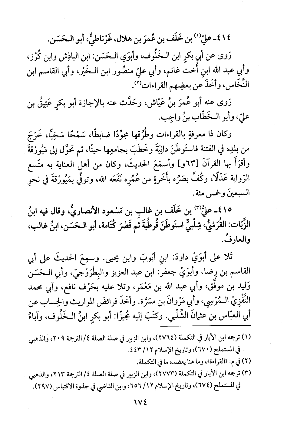 415 - عليُّ (¬3) بن خَلَف بن غالبِ بن مَسْعود الأنصاريُّ، وقال فيه ابنُ الزَّيّات: القُرَشيُّ، شِلْبيٌّ استَوطَنَ قُرطُبةَ ثم قَصْرَ كُتَامة، أبو الحَسَن، ابنُ غالب، والعارفُ.