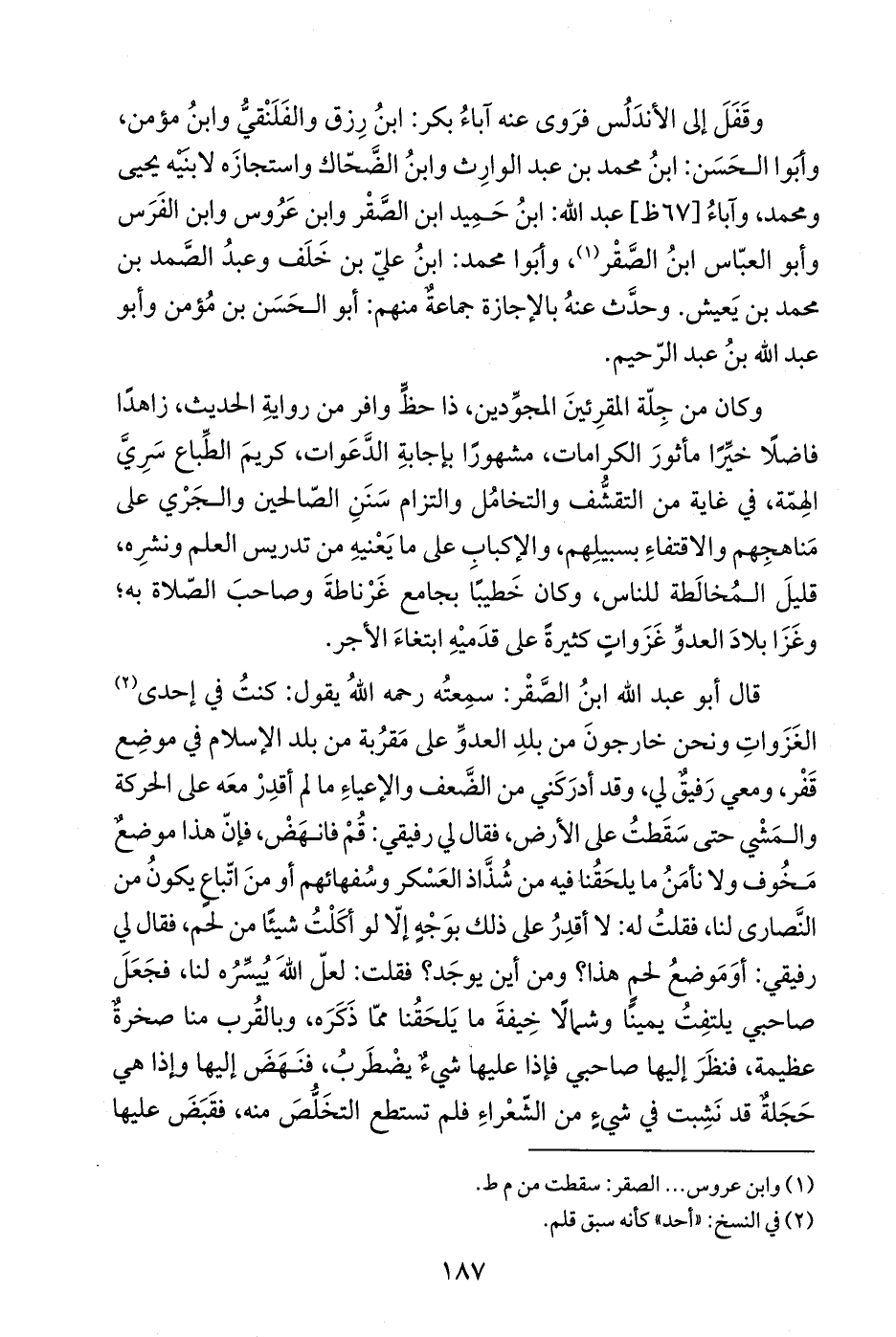 قال أبو عبد الله ابنُ الصَّقْر: سمِعتُه رحمه اللهُ يقول: كنتُ في إحدى (¬2) الغَزَواتِ ونحن خارجونَ من بلدِ العدوِّ على مَقرُبة من بلد الإسلام في موضِع قَفْر، ومعي رَفيقٌ لي، وقد أدرَكَني من الضَّعف والإعياءِ ما لم أقدِرْ معَه على الحركة والمَشْي حتى سَقَطتُ على الأرض، فقال لي رفيقي: قُمْ فانهَضْ، فإنّ هذا موضع مَخُوف ولا نأمَنُ ما يلحَقُنا فيه من شُذَّاذ العَسْكر وسُفهائهم أو منَ اتّباعٍ يكونُ من النَّصارى لنا، فقلتُ له: لا أقدِرُ على ذلك بوَجْهٍ إلّا لو أكَلْتُ شيئًا من لحم، فقال لي رفيقي: أوَ مَوضعُ لحمٍ هذا؟ ومن أين يوجَد؟ فقلت: لعلّ اللهَ يُيسِّرُه لنا، فجَعَلَ صاحبي يلتفِتُ يمينًا وشمالًا خِيفةَ ما يَلحَقُنا ممّا ذَكَرَه، وبالقُرب منا صخرةٌ عظيمة، فنظَرَ إليها صاحبي فإذا عليها شيءٌ يضْطَربُ، فنَهَضَ إليها وإذا هي حَجَلةٌ قد نَشِبت في شيءٍ من الشّعْراءِ فلم تستطع التخَلُّصَ منه، فقَبَضَ عليها