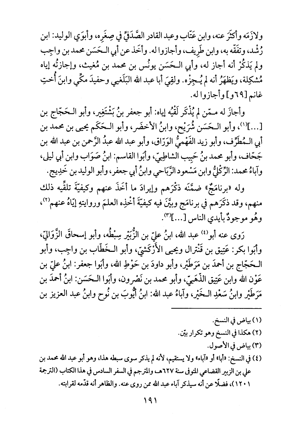 وأجازَ له ممّن لم يُذْكَر لَقْيُه إياه: أبو جعفر بنُ بَشْتَغِير، وأبو الحَجّاج بن [...] (¬1)، وأبو الحَسَن شُرَيْح، وابنُ الأخضَر، وأبو الحَكَم يحيى بن محمد بن أبي المُطّرِّف، وأبو زيد الفَهْميُّ الوَرّاق، وأبو عبد الله عبدُ الرَّحمن بن عبد الله بن جَحّاف، وأبو محمد بنُ حَبِيب الشاطِبيّ، وأبَوا القاسم: ابنُ صَوَاب وابن أبي ليلى، وآباءُ محمد: الرِّكْليُّ وابن مَسْعود الرَّبَاحي وابنُ أبي جعفر، وأبو الوليد بن خَدِيج.