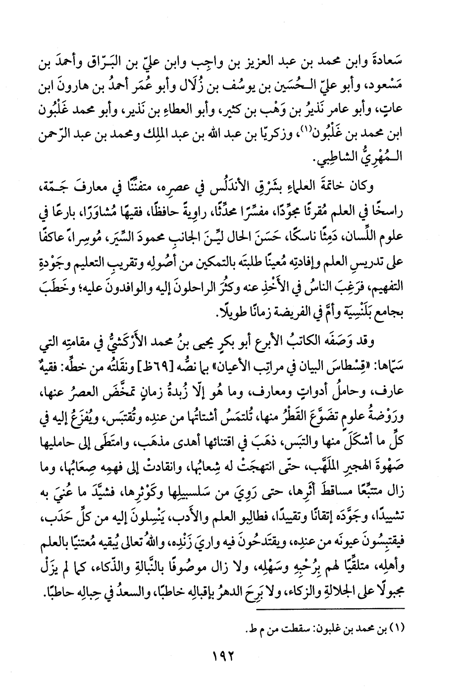 وقد وَصَفَه الكاتبُ الأبرع أبو بكرٍ يحيى بنُ محمد الأَرْكَشيُّ في مقامتِه التي سَمّاها: "قِسْطاسَ البيان في مراتِب الأعيان" بما نصُّه ونقَلتُه من خطِّه: فقيهٌ عارف، وحاملُ أدواتٍ ومعارف، وما هُو إلّا زُبدةُ زمانٍ تمخَّضَ العصرُ عنها، ورَوْضةُ علومٍ تضَوَّع القَطْرُ منها، تُلتمَسُ أشتاتُها من عندِه وتُقتبَس، ويُفزَعُ إليه في كلِّ ما أشكَلَ منها والتبَس، ذهَبَ في اقتنائها أهدى مذهَب، وامتَطَى إلى حامليها صَهْوةَ الهجيرِ الملَهَّب، حتّى انتهجَتْ له شِعابُها، وانقادتْ إلى فهمِه صِعَابُها، وما زال متتبِّعًا مساقطَ أثَرِها، حتى رَوِيَ من سَلسبيلِها وكَوْثرِها، فشيَّدَ ما عُنيَ به تشييدًا، وجَوَّدَه إتقانًا وتقييدًا، فطالِبو العلم والأَدب، يَنْسِلونَ إليه من كلِّ حَدَب، فيقتبِسُونَ عيونَه من عندِه، ويقتَدحُونَ فيه واريَ زَنْدِه، واللهُ تعالى يُبقيه مُعتنيًا بالعلم وأهلِه، متلقِّيًا لهم بِرُحْبِهِ وسَهْلِه، ولا زال موصُوفًا بالنَّبالةِ والذّكاء، كما لم يزَلْ مجبولًا على الجلالةِ والزكاء، ولا بَرِحَ الدهرُ بإقبالِه خاطبًا، والسعدُ في حِبالِه حاطبًا.