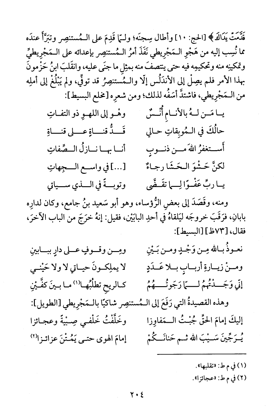 وهذه القصيدةُ التي رَفَعَ إلى المُستنصِر شاكيًا بالمَجْرِيطي [الطويل]: