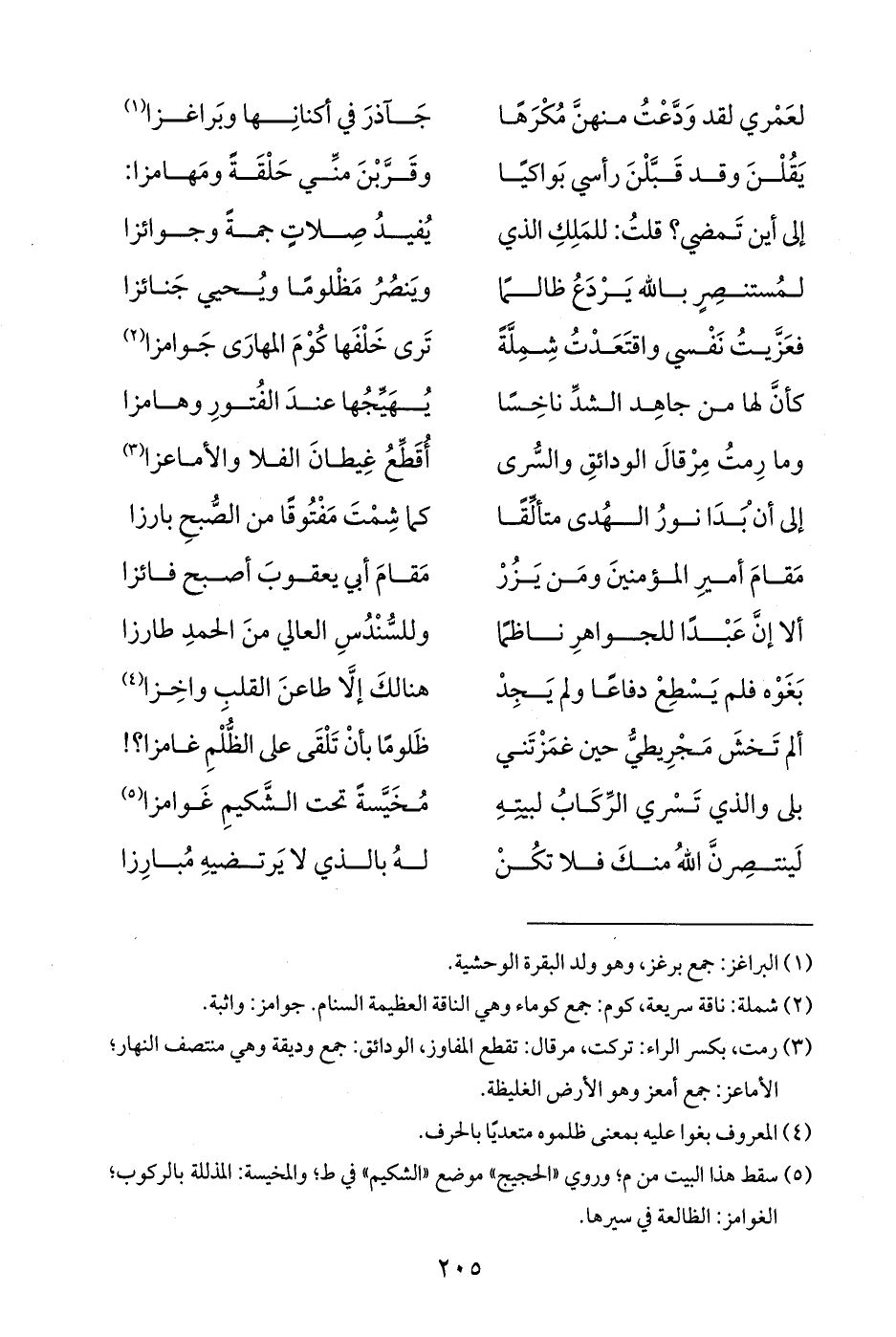 (¬3) رمت، بكسر الراء: تركت، مرقال: تقطع المفاوز، الودائق: جمع وديقة وهي منتصف النهار؛ الأماعز: جمع أمعز وهو الأرض الغليظة.