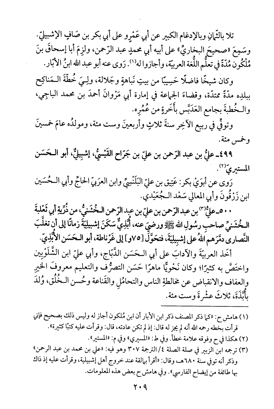500 - عليُّ (¬3) بن عبد الرّحمن بن عليّ بن عبد الرّحمن الخُشَنيُّ، من ذُرِّيةِ أبي ثَعْلبةَ الخُشَنيِّ صاحب رسُولِ الله - صَلَّى الله عليه وسلم - ورضيَ عنه، أُبَّذِيٌّ سَكَنَ إشبيلِيَةَ زمانًا إلى أن تغلَّبَ النَّصارى دمَّرَهم اَللهُ على إشبِيلِيَةَ، فتحَوَّلَ إلى غَرْناطة، أبو الحَسَن الأُبَّذِيّ.