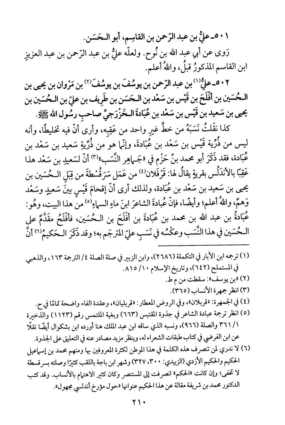 (¬6) لا ندري لمن تنصرف هذه الكلمة في هذا الموطن لكثرة المعروفين بها ومنهم محمد بن إسماعيل الحكيم والحكيم الأزدي (الزبيدي: 300، 327) وشهر ابن باجة باللقب كثيرًا وصلته بسرقسطة لا تخفى؛ وإن كانت "الحكم" انصرفت إلى المستنصر وكان كثير الاهتمام بالأنساب. وقد كتب الدكتور محمد بن شريفة مقالة عن هذا الحكيم عنوانها "حول مؤرخ أندلسي مجهول".