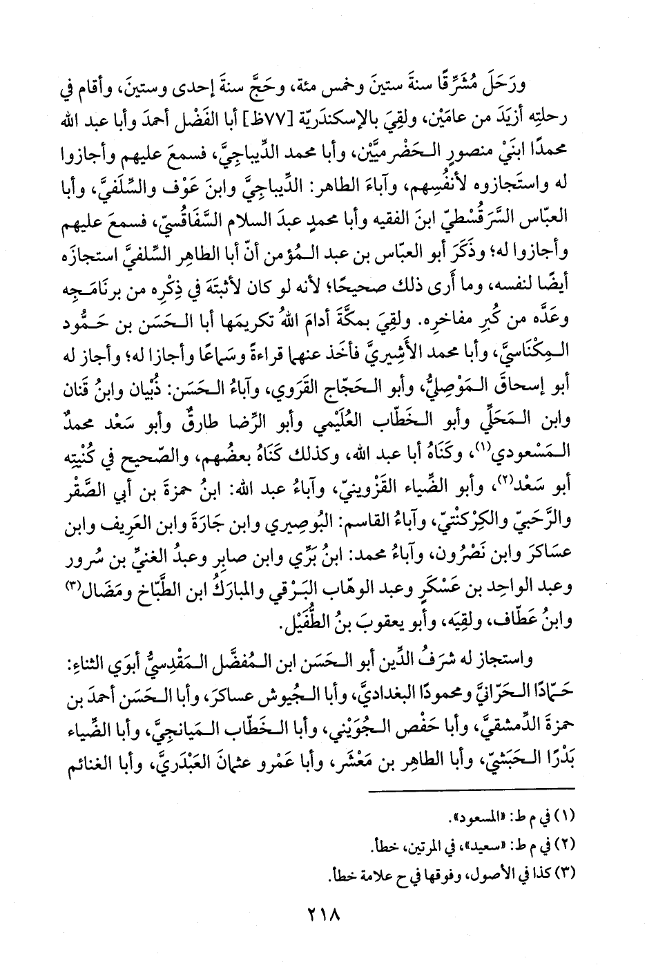 ورَحَلَ مُشَرِّقًا سنةَ ستينَ وخمس مئة، وحَجَّ سنةَ إحدى وستينَ، وأقام في رحلتِه أزيَدَ من عامَيْن، ولقِيَ بالإسكندَريّة أبا الفَضْل أحمدَ وأبا عبد الله محمدًا ابنَيْ منصورٍ الحَضْرميَّيْن، وأبا محمد الدِّيباجِيَّ، فسمعَ عليهم وأجازوا له واستَجازوه لأنفُسِهم، وآباءَ الطَّاهر: الدِّيباجِيَّ وابنَ عَوْف والسِّلَفيَّ، وأبا العبّاس السَّرَقُسْطيّ ابنَ الفقيه وأبا محمدٍ عبدَ السَّلام السَّفَاقُسيّ، فسمعَ عليهم وأجازوا له؛ وذَكَرَ أبو العبّاس بن عبد المُؤمن أنّ أبا الطاهِر السِّلفيَّ استجازَه أيضاً لنفسه، وما أرى ذلك صحيحًا؛ لأنَّه لو كان لأثبتَهَ في ذِكْرِه من برنَامَجِه وعَدَّه من كُبرِ مفاخرِه. ولقِيَ بمكَّةَ أدامَ اللهُ تكريمَها أبا الحَسَن بن حَمُّود المِكْنَاسيَّ، وأبا محمد الأَشِيريَّ فأخَذ عنهما قراءةً وسَماعًا وأجازا له؛ وأجاز له أبو إسحاقَ المَوْصِليُّ، وأبو الحَجّاج القَرَوي، وآباءُ الحَسَن: ذُبْيان وابنُ قَنان وابن المَحَلِّي وأبو الخَطّاب العُلَيْمي وأبو الرِّضا طارقٌ وأبو سَعْد محمدٌ المَسْعودي (¬1)، وكَنَاهُ أبا عبد الله، وكذلك كَنَاهُ بعضُهم، والصّحيح في كُنْيتِه أبو سَعْد (¬2)، وأبو الضِّياء القَزْوينيّ، وآباءُ عبد الله: ابنُ حمزةَ بن أبي الصَّقْر والرَّحَبيّ والكِرْكنْتيّ، وآباءُ القاسم: البُوصِيري وابن جَارَةَ وابن العَرِيف وابن عسَاكرَ وابن نَصْرُون، وآباءُ محمد: ابنُ بَرِّي وابن صابِر وعبدُ الغنيِّ بن سُرور وعبد الواحِد بن عَسْكَرٍ وعبد الوهّاب البَرْقي والمبارَكُ ابن الطَّبّاخ ومَضَال (¬3) وابنُ عَطّاف، ولقِيَه، وأبو يعقوبَ بنُ الطُّفَيْل.