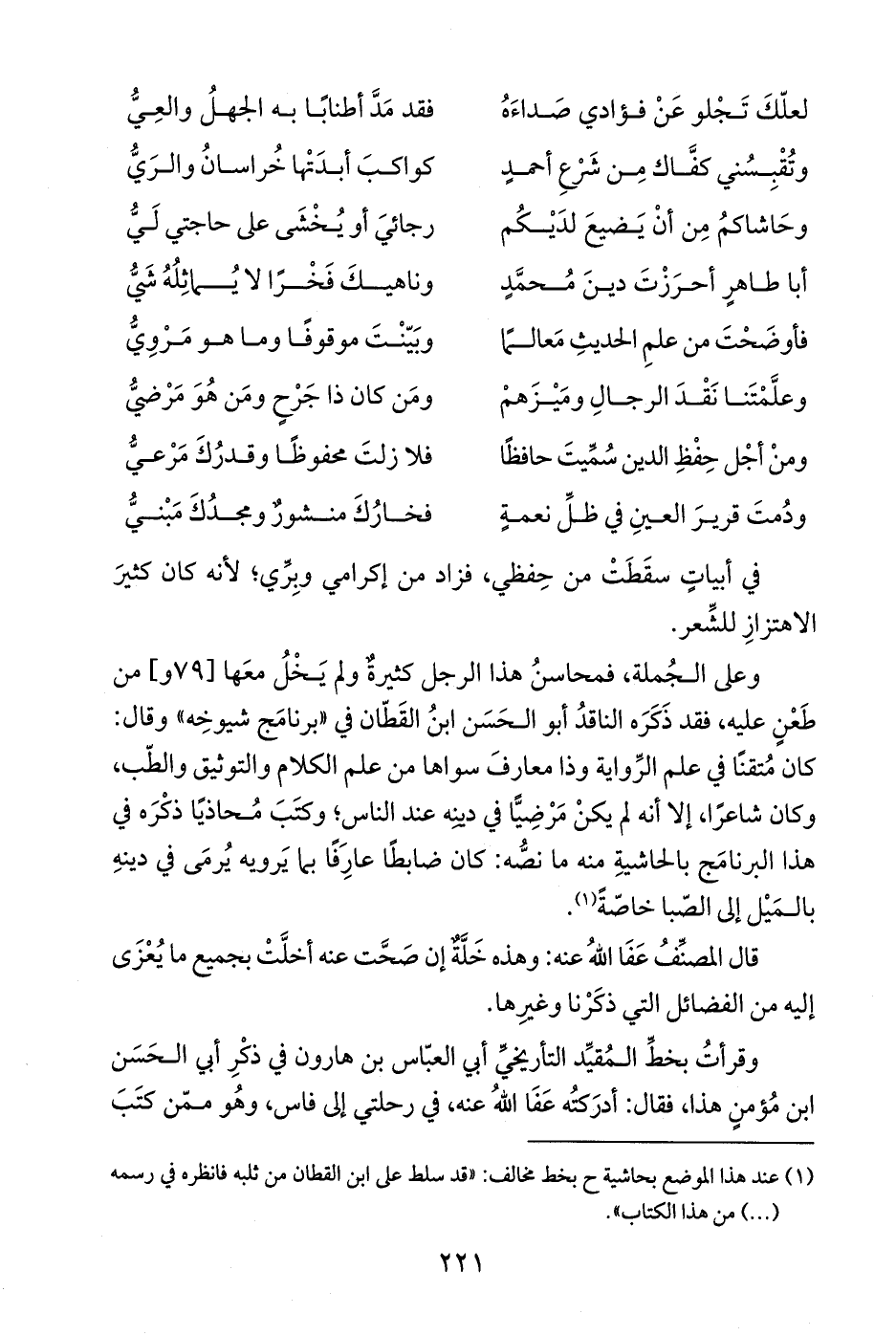وعلى الجُملة، فمحاسنُ هذا الرجل كثيرةٌ ولم يَخْلُ معَها من طَعْنٍ عليه، فقد ذَكَرَه الناقدُ أبو الحَسَن ابنُ القَطّان في "برنامَج شيوخِه" وقال: كان مُتقنًا في علم الرِّواية وذا معارفَ سواها من علم الكلام والتوثيق والطّب، وكان شاعرًا، إلا أنه لم يكنْ مَرْضِيًّا في دينِه عند الناس، وكتَبَ مُحاذيًا ذكْرَه في هذا البرنامَج بالحاشيةِ منه ما نصُّه: كان ضابطًا عارِفًا بما يَرويه يُرمَى في دينهِ بالمَيْل إلى الصّبا خاصّةً (¬1).