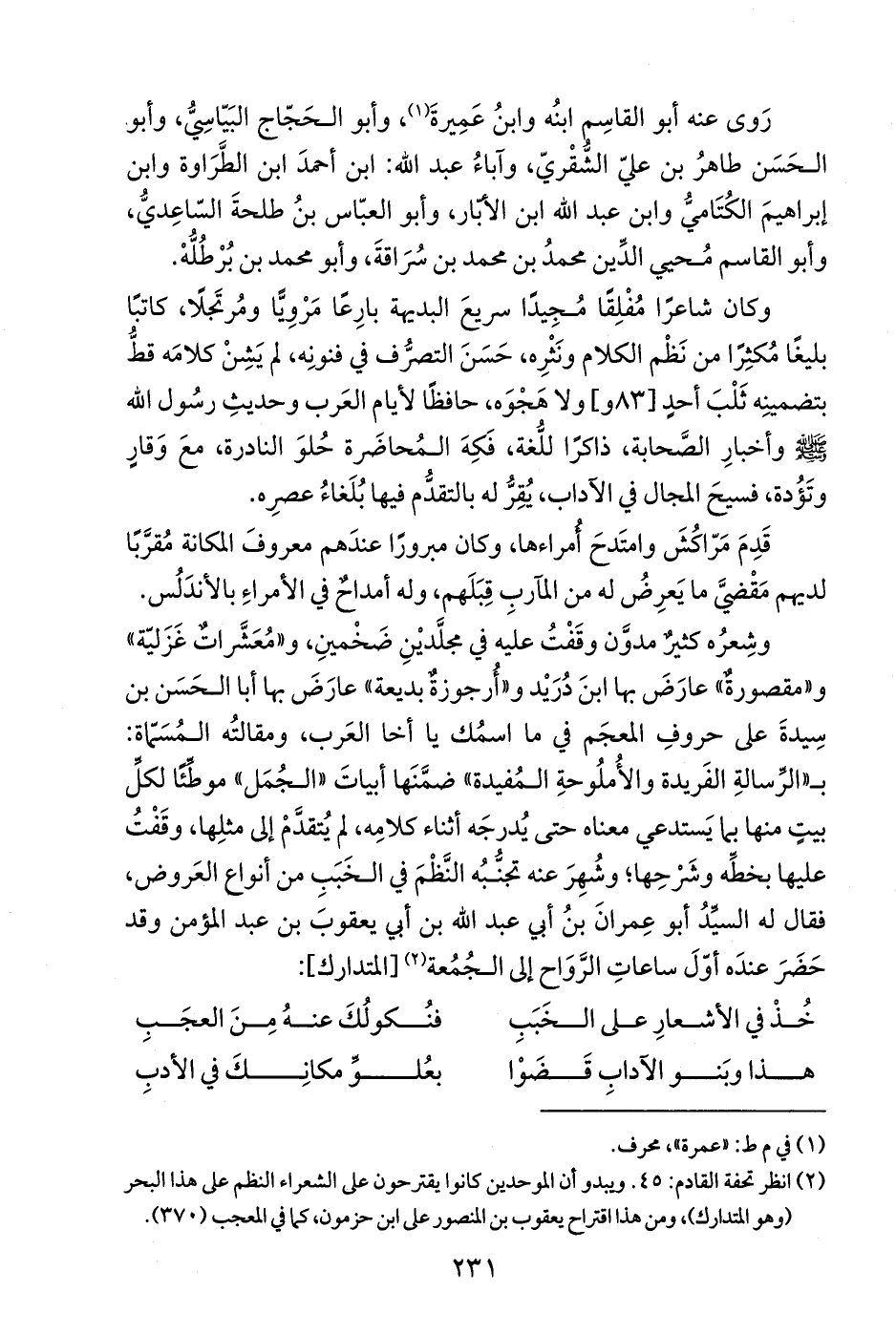 (¬2) انظر تحفة القادم: 45. ويبدو أن الموحدين كانوا يقترحون على الشعراء النظم على هذا البحر (وهو المتدارك)، ومن هذا اقتراح يعقوب بن المنصور على ابن حزمون، كما في المعجب (370).