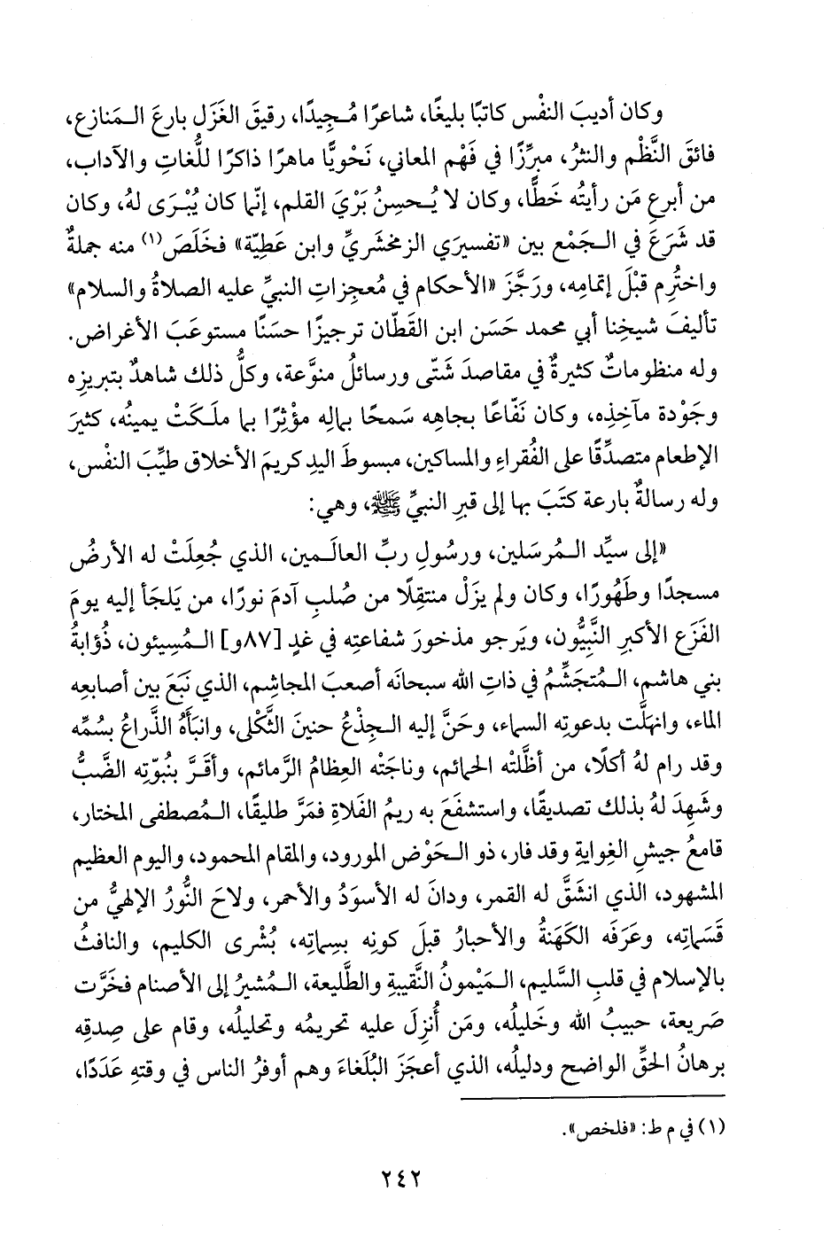 "إلى سيِّد المُرسَلين، ورسُولِ ربِّ العالَمين، الذي جُعِلَتْ له الأرضُ مسجدًا وطَهُورًا، وكان ولم يزَلْ منتقِلاً من صُلبِ آدمَ نورًا، من يَلجَأ إليه يومَ الفَزَع الأكبرِ النَّبِيُّون، ويَرجو مذخورَ شفاعتِه في غدٍ المُسِيئون، ذُؤابةُ بني هاشمِ، المُتجَشِّمُ في ذاتِ الله سبحانَه أصعبَ المجاشِم، الذي نبَعَ بين أصابعِه الماء، وانهَلَّت بدعوته السماء، وحَنَّ إليه الجِذْعُ حنينَ الثَّكْلى، وأنبَأَهُ الذَّراعُ بسُمِّه وقد رام لهُ أكلًا، من أظَّلتْه الحمائم، وناجَتْه العِظامُ الرَّمائم، وأقَرَّ بنُبوّتِه الضَّبُّ وشَهِدَ لهُ بذلك تصديقًا، واستشفَعَ به ريمُ الفَلاةِ فمَرَّ طليقًا، المُصطفى المختار، قامعُ جيشِ الغِوايةِ وقد فار، ذو الحَوْض المورود، والمقام المحمود، واليوم العظيم المشهود، الذي انشَقَّ له القمر، ودانَ له الأسوَدُ والأحمر، ولاحَ النُّورُ الإلهيُّ من قَسَماتِه، وعَرَفَه الكَهَنةُ والأحبارُ قبلَ كونِه بسِماتِه، بُشْرى الكليم، والنافثُ بالإسلام في قلبِ السَّليم، المَيْمونُ النَّقيبةِ والطَّليعة، المُشيرُ إلى الأصنام فخَرَّت صَريعة، حبيبُ الله وخَليلُه، ومَن أُنزِلَ عليه تحريمُه وتحليلُه، وقام على صِدقِه برهانُ الحقِّ الواضح ودليلُه، الذي أعجَزَ البُلَغاءَ وهم أوفرُ الناس في وقتهِ عَدَدًا،