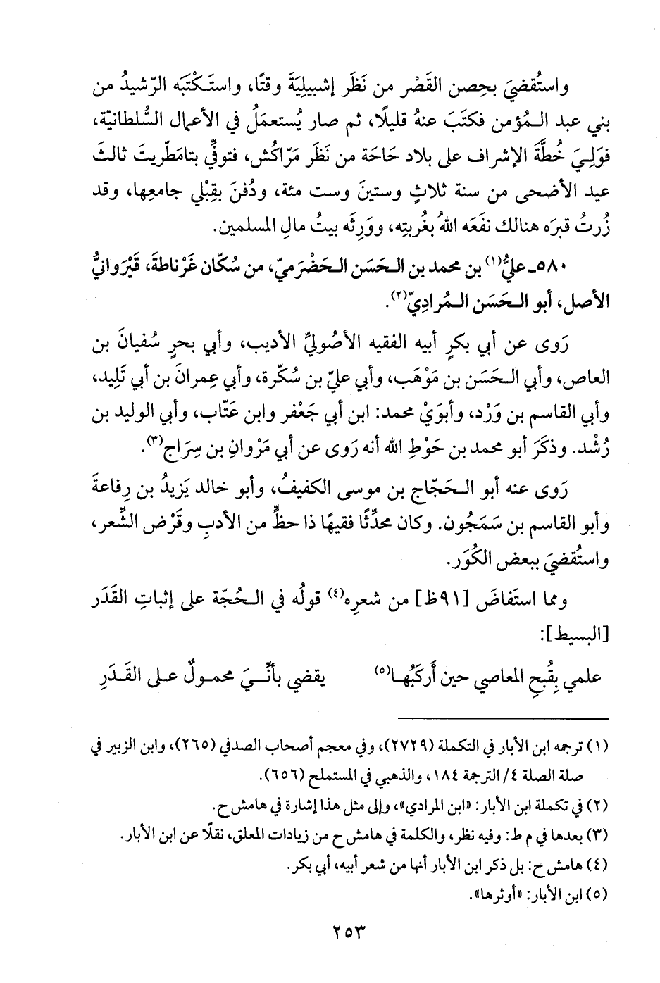580 - عليُّ (¬1) بن محمد بن الحَسَن الحَضْرَميّ، من سُكّان غَرْناطةَ، قَيْرَوانيُّ الأصل، أبو الحَسَن المُرادِيّ (¬2).