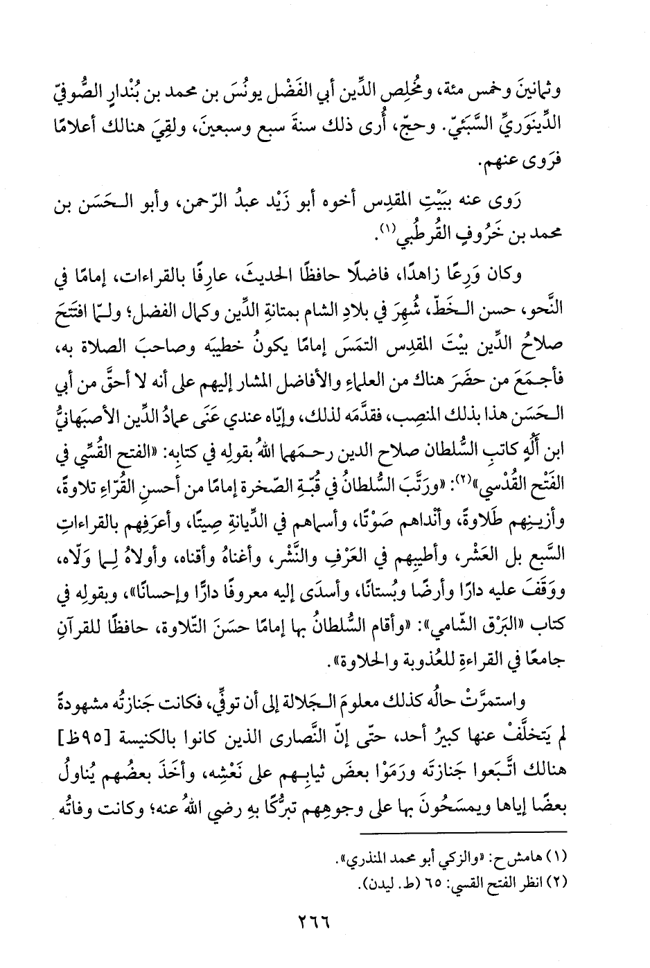 وكان وَرِعًا زاهدًا، فاضلًا حافظًا الحديثَ، عارِفًا بالقراءات، إمامًا في النَّحو، حسن الخَطّ، شُهِرَ في بلادِ الشام بمتانةِ الدِّين وكمال الفضل؛ ولمّا افتَتحَ صلاحُ الدِّين بيْتَ المقدِس التمَسَ إمامًا يكونُ خطيبَه وصاحبَ الصلاة به، فأجمَعَ من حضَرَ هناك من العلماءِ والأفاضل المشار إليهم على أنه لا أحقَّ من أبي الحَسَن هذا بذلك المنصِب، فقدَّمَه لذلك، وإيّاه عندي عَنَى عمادُ الدِّين الأصبَهانيُّ ابن أَلُهٍ كاتبِ السُّلطان صلاح الدين رحمَهما اللهُ بقولِه في كتابه: "الفتح القُسِّي في الفَتْح القُدْسي" (¬2): "ورَتَّبَ السُّلطانُ في قُبّةِ الصّخرة إمامًا من أَحسنِ القُرّاءِ تلاوةً، وأزينِهم طَلاوةً، وأنْداهم صَوْتًا، وأسماهم في الدِّيانةِ صِيتًا، وأعرَفِهم بالقراءاتِ السَّبع بل العَشْر، وأطيبِهم في العَرْفِ والنَّشْر، وأغناهُ وأقناه، وأولاهُ لِما وَلّاه، ووَقَفَ عليه دارًا وأرضًا وبُستانًا، وأسدَى إليه معروفًا دارًّ وإحسانًا"، وبقولِه في كتاب "البَرْق الشّامي": "وأقام السُّلطانُ بها إمامًا حسَنَ التّلاوة، حافظًا للقرآنِ جامعًا في القراءةِ للعُذوبة والحلاوة".