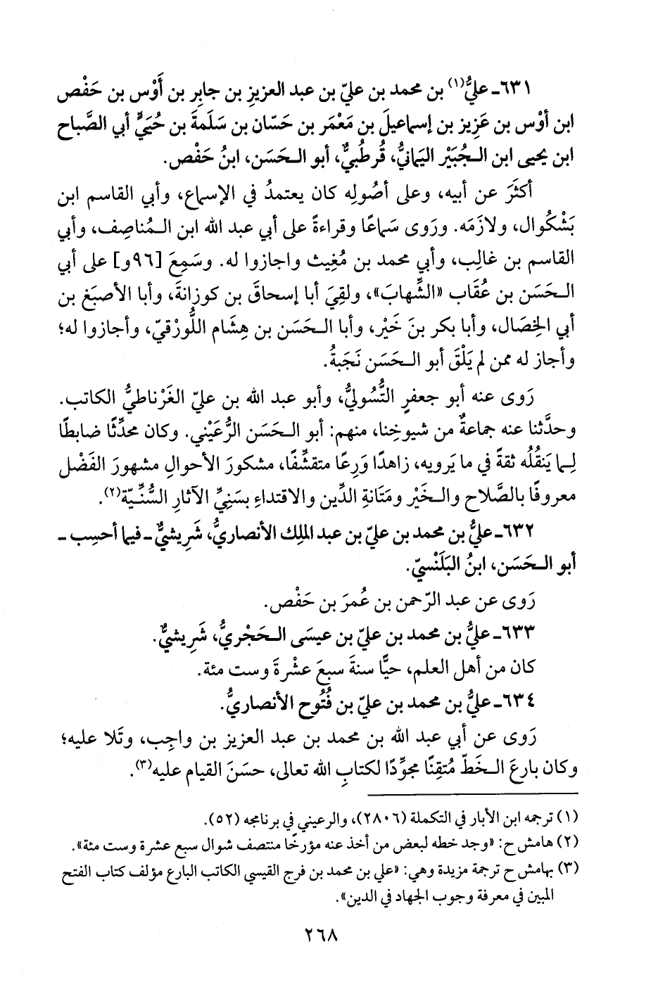 631 - عليُّ (¬1) بن محمد بن عليّ بن عبد العزيزِ بن جابِر بن أَوْس بن حَفْص ابن أوْس بن عَزِيز بن إسماعيلَ بن مَعْمَر بن حَسّان بن سَلَمةَ بن حُيَيٍّ أبي الصَّباح ابن يحيى ابن الجُبَيْر اليَمانيُّ، قُرطُبيٌّ، أبو الحَسَن، ابنُ حَفْص.