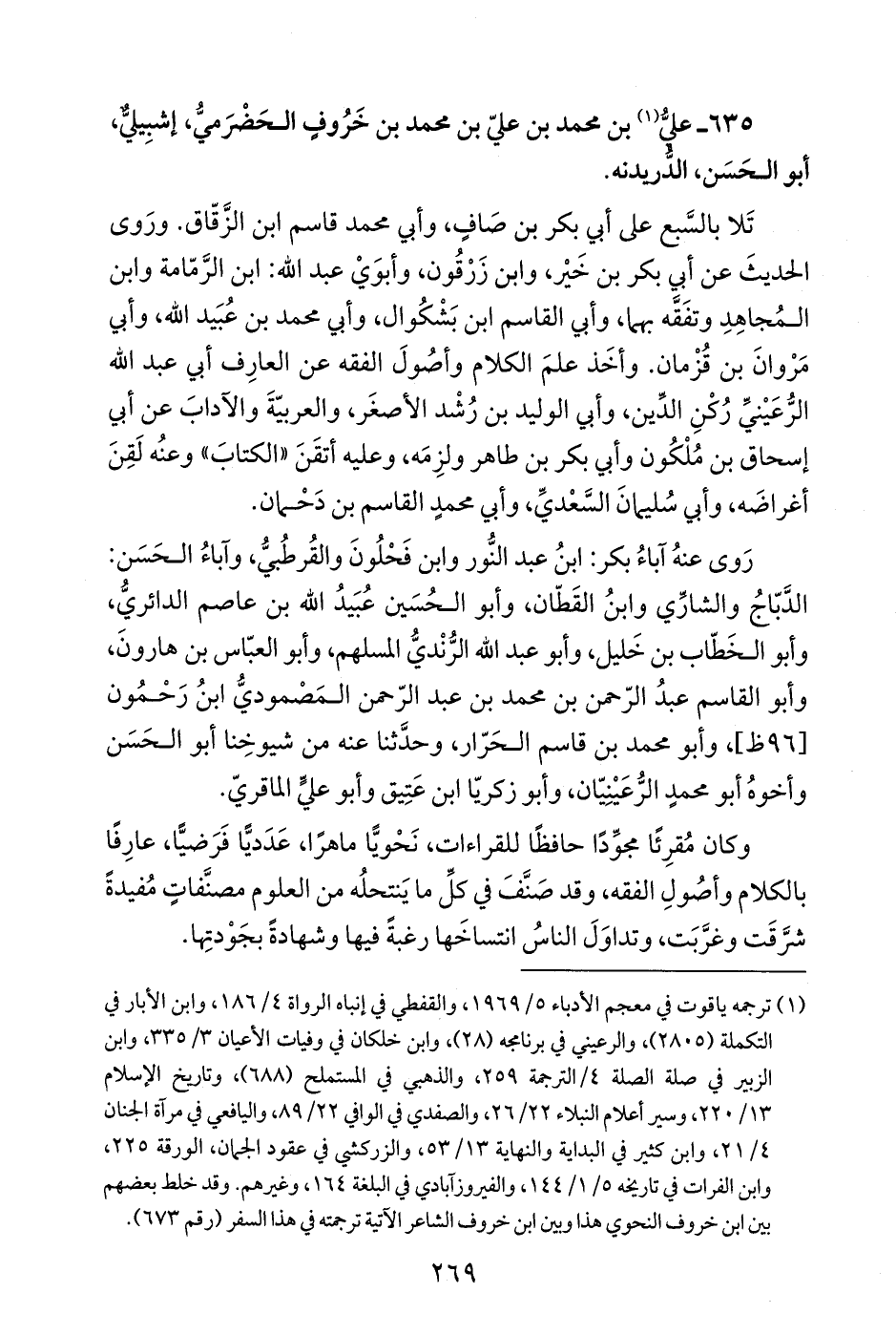 635 - عليُّ (¬1) بن محمد بن عليّ بن محمد بن خَرُوفٍ الحَضْرَميُّ، إشبِيليٌّ، أبو الحَسَن، الدُّريدنه.