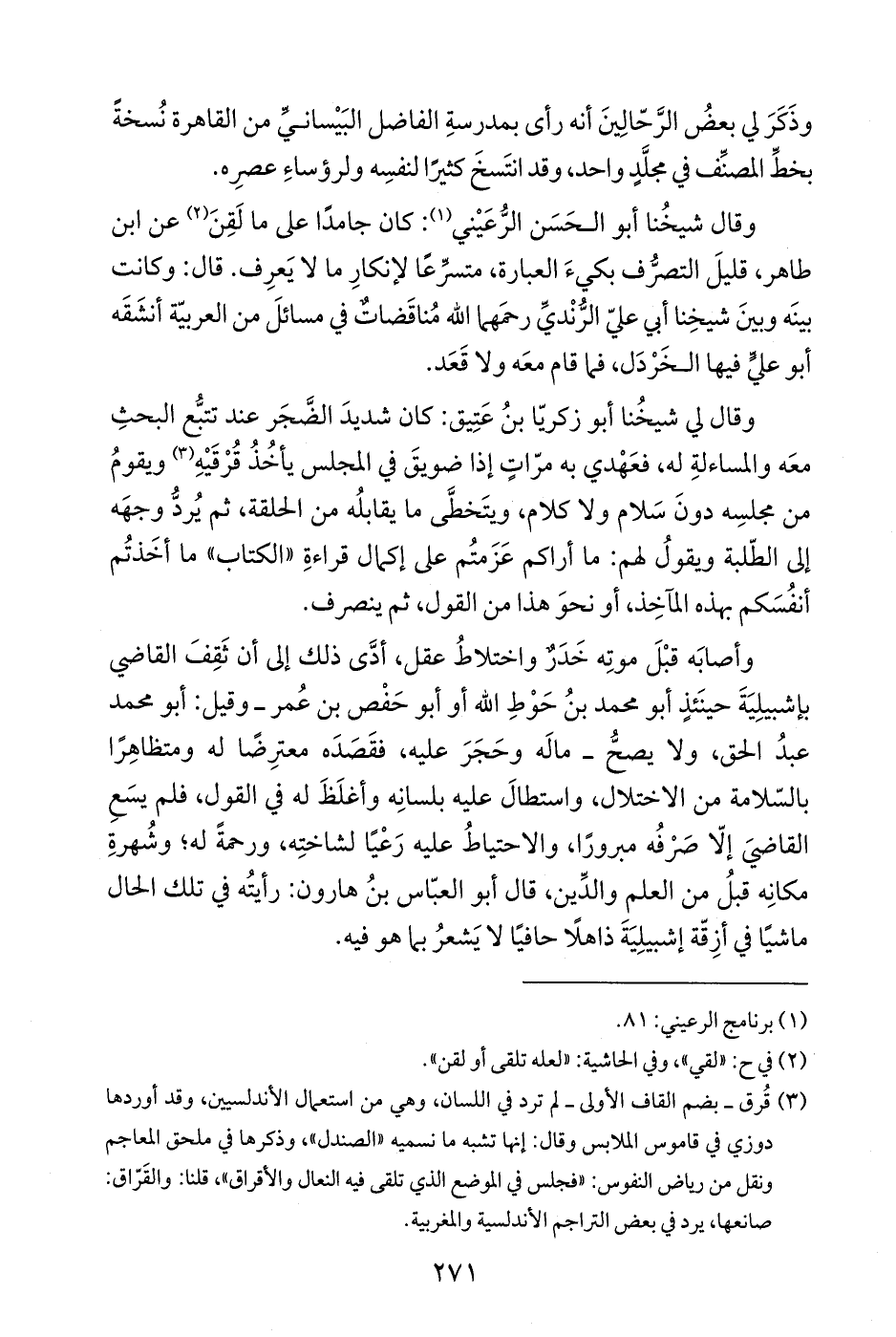 وقال شيخُنا أبو الحَسَن الرُّعَيْني (¬1): كان جامدًا على ما لَقِنَ (¬2) عن ابن طاهر، قليلَ التصرُّف بكيءَ العبارة، متسرِّعًا لإنكارِ ما لا يَعرِف. قال: وكانت بينَه وبينَ شيخِنا أبي عليّ الرُّنْديِّ رحمَهما الله مُناقَضاتٌ في مسائلَ من العربيّة أنشَقَه أبو عليٍّ فيها الخَرْدَل، فما قام معَه ولا قَعَد.