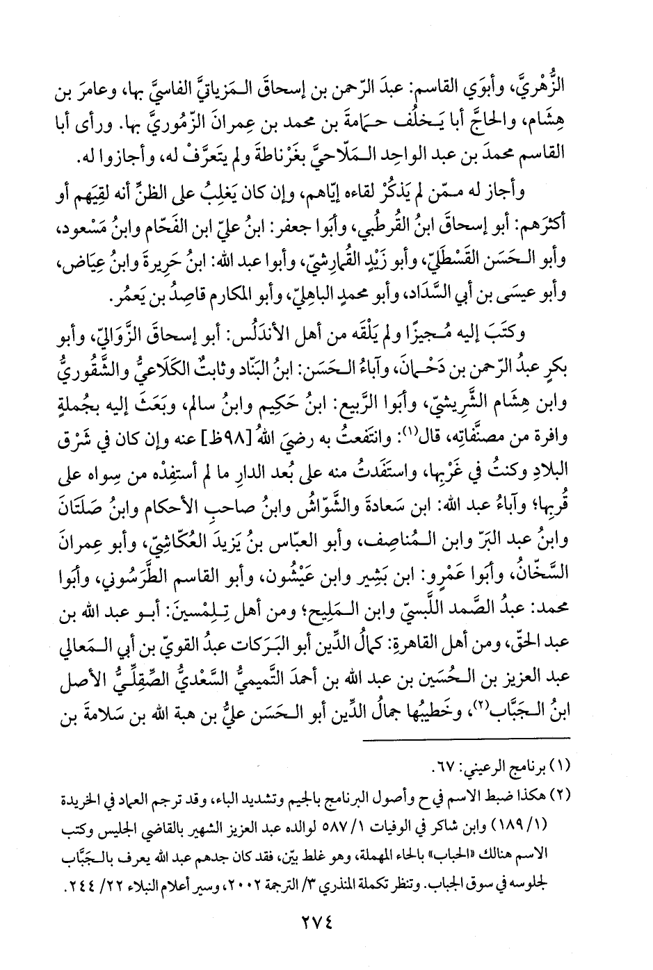 (¬2) هكذا ضبط الاسم في ح وأصول البرنامج بالجيم وتشديد الباء، وقد ترجم العماد في الخريدة (1/ 189) وابن شاكر في الوفيات 1/ 587 لوالده عبد العزيز الشهير بالقاضي الجليس وكتب الاسم هنالك "الحباب" بالحاء المهملة، وهو غلط بيّن، فقد كان جدهم عبد الله يعرف بالجَبَّاب لجلوسه في سوق الجباب. وتنظر تكملة المنذري 3/الترجمة 2002، وسير أعلام النبلاء 22/ 244.
