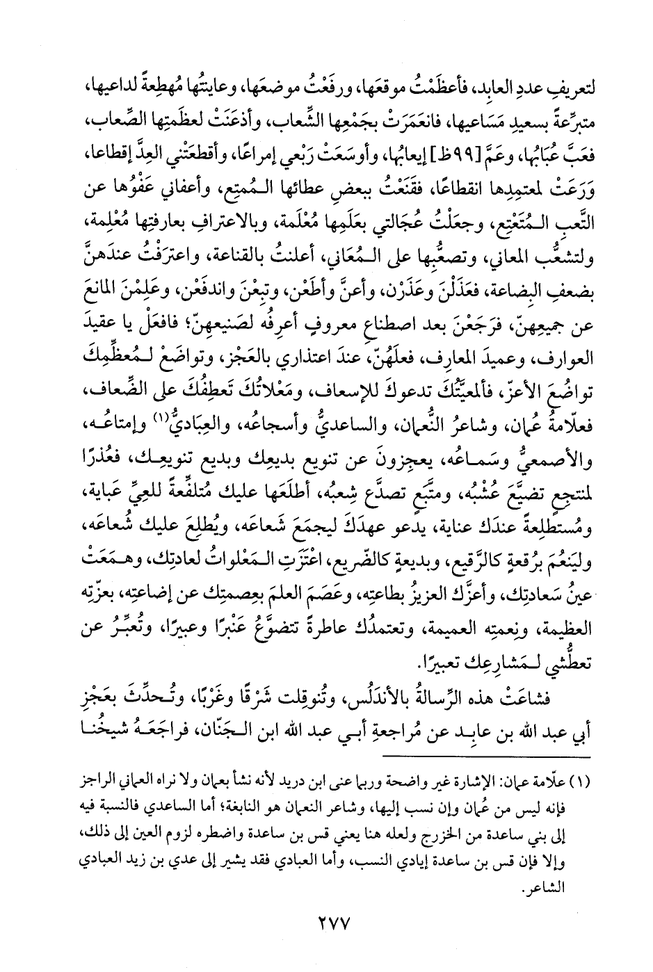 لتعريفِ عددِ العابِد، فأعظَمْتُ موقعَها، ورفَعْتُ موضعَها، وعاينتُها مُهطِعةً لداعيها، متبرِّعةً بسعيدِ مَسَاعيها، فانعَمَرَتْ بجَمْعِها الشِّعاب، وأذعَنَتْ لعظَمتِها الصِّعاب، فعَبَّ عُبَابُها، وعَمَّ [99 ظ] إيعابُها، وأوسَعَتْ رَبْعي إمراعًا، وأقطعَتْني العِدَّ إقطاعا، وَرَعَتْ لمعتمِدِها انقطاعًا، فقَنَعْتُ ببعضِ عطائها المُمتِع، وأعفاني عَفْوُها عن التَّعبِ المُتَعْتِع، وجعَلْتُ عُجَالتي بعَلَمِها مُعْلَمة، وبالاعترافِ بعارفتِها مُعْلِمة، ولتشعُّب المعاني، وتصعُّبِها على المُعَاني، أعلنتُ بالقناعة، واعترَفْتُ عندَهنَّ بضعفِ البِضاعة، فعَذَلْنَ وعَذَرْن، وأعنَّ وأطَعْن، وتبِعْنَ واندفَعْن، وعَلِمْنَ المانعَ عن جميعِهنّ، فرَجَعْنَ بعد اصطناعِ معروفٍ أعرِفُه لصنيعهِنّ؛ فافعَلْ يا عقيدَ العوارف، وعميدَ المعارِف، فعلَهُنّ، عندَ اعتذاري بالعَجْز، وتواضَعْ لمُعظِّمِكَ تواضُعَ الأعزّ، فألمعيَّتُكَ تدعوكَ للإسعاف، ومَعْلاتُكَ تَعطِفُكَ على الضِّعاف، فعلّامةُ عُمان، وشاعرُ النُّعمان، والساعديُّ وأسجاعُه، والعِبَاديُّ (¬1) وإمتاعُه، والأصمعيُّ وسَماعُه، يعجِزونَ عن تنويع بديعِك وبديع تنويعِك، فعُذرًا لمنتجعٍ تضيَّعَ عُشْبُه، ومتَّبَعٍ تصدَّع شِعبُه، أطلَعَها عليك مُتلفِّعةً للعِيِّ عَباية، ومُستطلِعةً عندَك عناية، يدعو عهدَكَ ليجمَعَ شَعاعَه، ويُطلِعَ عليك شُعاعَه، وليَنعُمَ برُقعةٍ كالرَّقيع، وبديعةٍ كالضّريع، اعْتَزَتِ المَعْلواتُ لعادتِك، وهمَعَتْ عينُ سَعادتِك، وأعزَّك العزيزُ بطاعتِه، وعَصَمَ العلمَ بعِصمتِك عن إضاعتِه، بعزّتِه العظيمة، ونِعمتِه العميمة، وتعتمدُك عاطرةً تتضوَّعُ عَنْبرًا وعبيرًا، وتُعبِّرُ عن تعطُّشي لمَشارِعِك تعبيرًا.