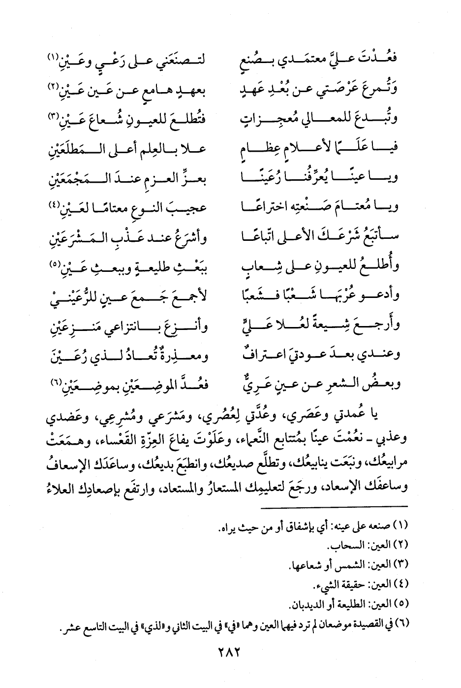 (¬6) في القصيدة موضعان لم ترد فيهما العين وهما "في" في البيت الثاني و"لذي" في البيت التاسع عشر.