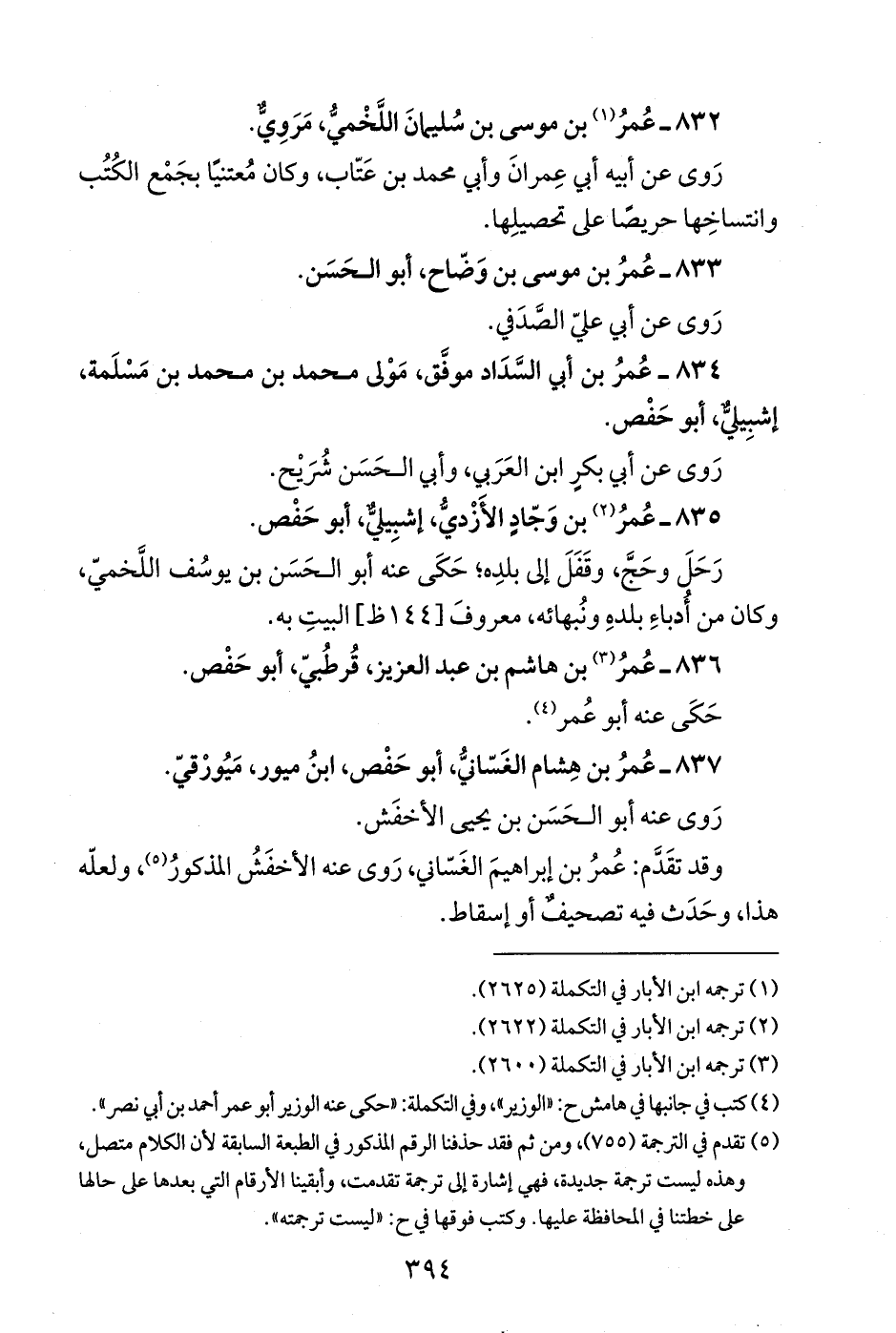 834 - عُمرُ بن أبي السَّدَاد موفَّق، مَوْلى محمد بن محمد بن مَسْلَمة، إشبِيليٌّ، أبو حَفْص.