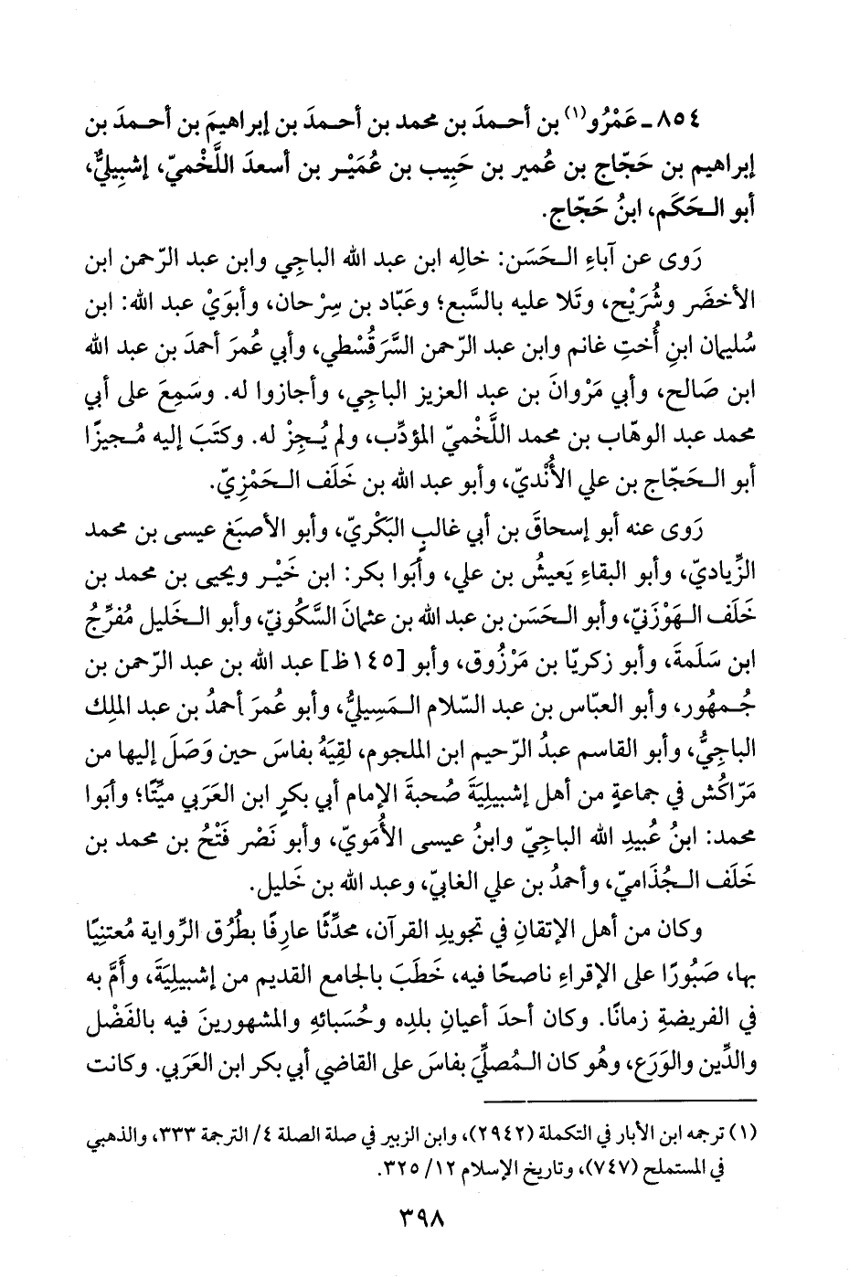 854 - عَمْرُو (¬1) بن أحمدَ بن محمد بن أحمدَ بن إبراهيمَ بن أحمدَ بن إبراهيم بن حَجّاج بن عُمير بن حَبِيب بن عُمَيْر بن أسعدَ اللَّخْميّ، إشبِيليٌّ، أبو الحَكَم، ابنُ حَجّاج.