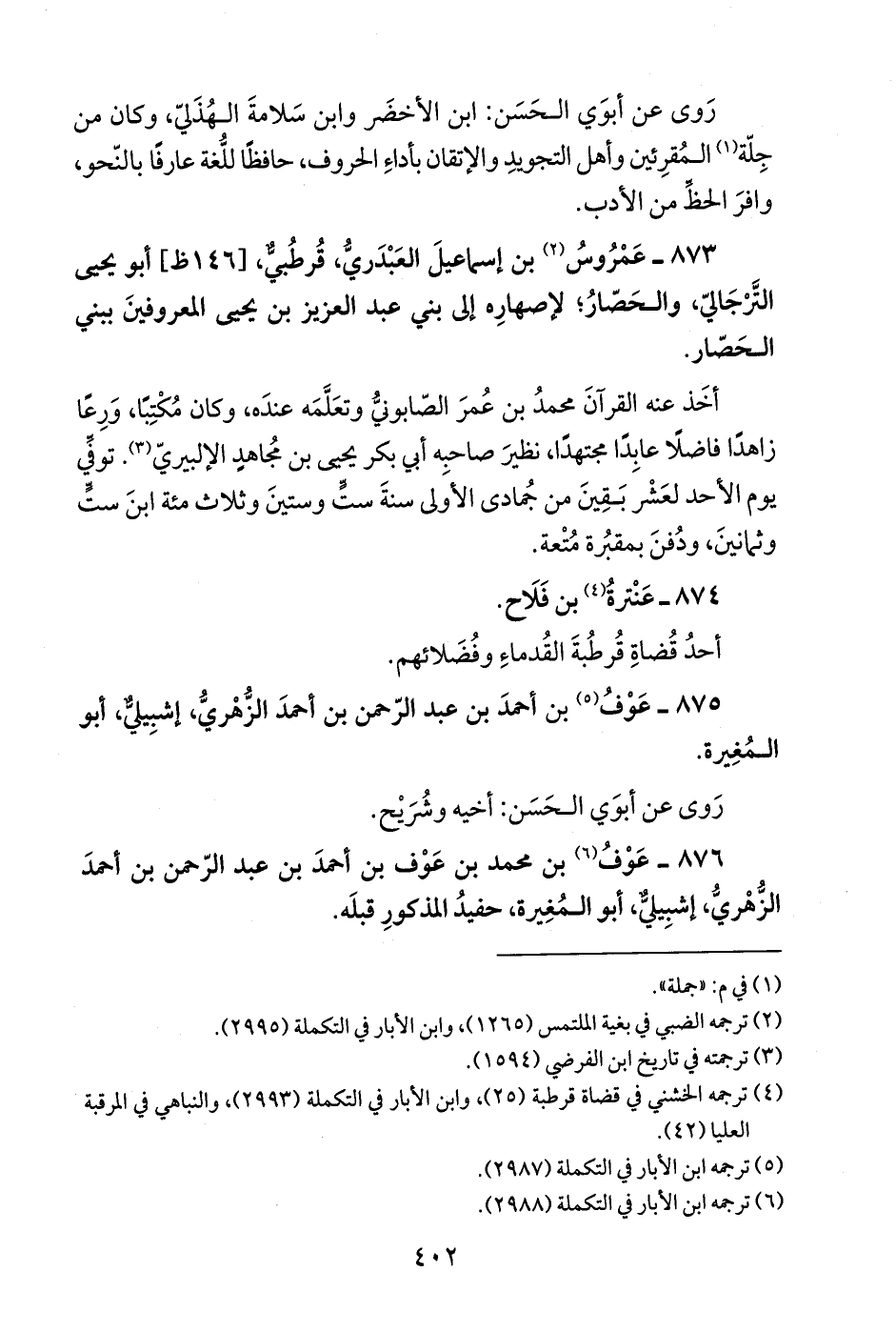 875 - عَوْفُ (¬5) بن أحمدَ بن عبد الرّحمن بن أحمدَ الزُّهْريُّ، إشبيليٌّ، أبو المُغِيرة.
