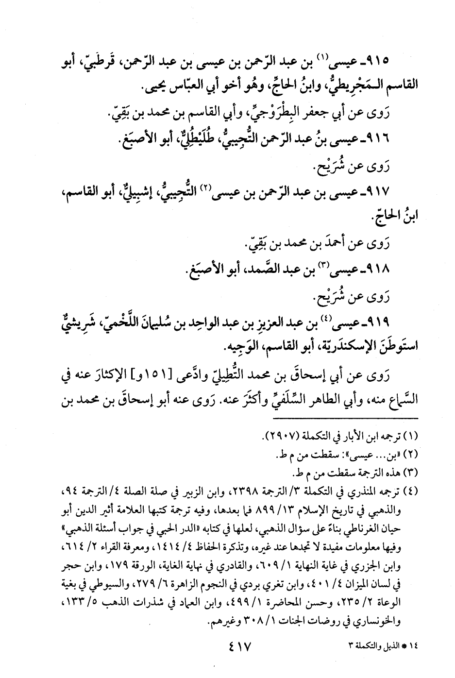915 - عيسى (¬1) بن عبد الرّحمن بن عيسى بن عبد الرّحمن، قَرطبيّ، أبو القاسم المَجْرِيطيُّ، وابنُ الحاجِّ، وهُو أخو أبي العبّاس يحيى.