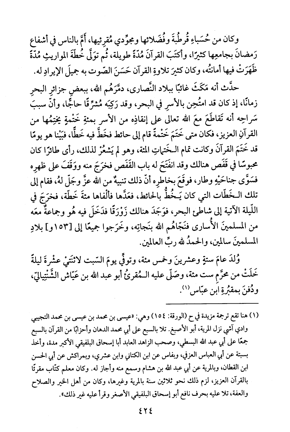 حدَّث أنه مَكَثَ غائبًا ببلاد النَّصارى، دمَّرَهُم الله، ببعضِ جزائرِ البحرِ زمانًا، إذ كان قد امتُحِن بالأسرِ في البحر، وقد رَكِبَه مُشرِّقًا حاجًّا، وأنّ سببَ سَراحِه أنه تَقاطَعَ معَ الله تعالى على إنقاذِه من الأسر بمئةِ خَتْمةٍ يختِمُها من القرآنِ العزيز، فكان متى خَتَمَ خَتْمةً قام إلى حائط فخَطَّ فيه خَطًّا، فبَيْنا هو يومًا قد خَتَمَ القرآنَ وكانت تمام الخَتماتِ المئة، وهو لم يَشعُرْ لذلك، رأى طائرًا كان محبوسًا في قَفَص هنالك وقد انفَتَحَ له باب القَفَص فخرَجَ منه ووَقَفَ على ظهرِه فسَوَّى جناحَيْهِ وطار، فوقَعَ بخاطرِه أنّ ذلك تنبيهٌ من الله عزَّ وجَلّ لهُ، فقام إلى تلك الخَطّات التي كان يَخُطُّ بالحائط، فعَدَّها فألْفاها مئةَ خَطّة، فخرَجَ في اللّيلة الآتية إلى شاطئ البحر، فوَجَدَ هنالك زَوْرَقًا فدَخَلَ فيه هُو وجماعةٌ معَه من المسلمينَ الأُسارى فنَجّاهُم الله بنَجاتِه، وخَرَجوا جميعًا إلى [153 و] بلادِ المسلمينَ سالمين، والحمدُ لله ربِّ العالمين.