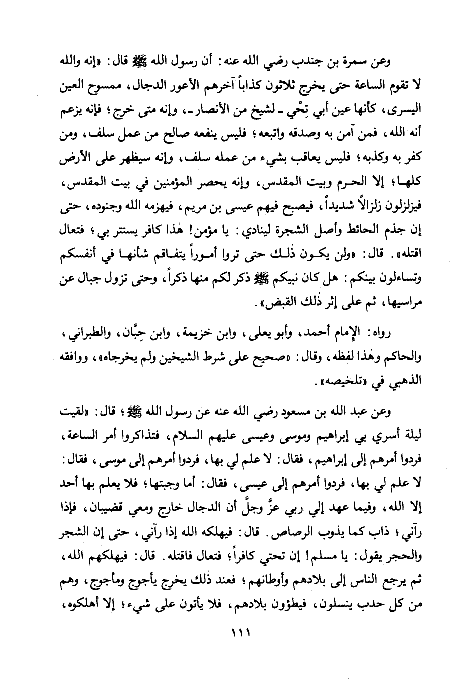 وعن عبد الله بن مسعود رضي الله عنه عن رسول الله صلى الله عليه وسلم؛ قال: «لقيت ليلة أسري بي إبراهيم وموسى وعيسى عليهم السلام، فتذاكروا أمر الساعة، فردوا أمرهم إلى إبراهيم، فقال: لا علم لي بها، فردوا أمرهم إلى موسى، فقال: لا علم لي بها، فردوا أمرهم إلى عيسى، فقال: أما وجبتها؛ فلا يعلم بها أحد إلا الله، وفيما عهد إلي ربي عز وجل أن الدجال خارج ومعي قضيبان، فإذا رآني؛ ذاب كما يذوب الرصاص. قال: فيهلكه الله إذا رآني، حتى إن الشجر والحجر يقول: يا مسلم! إن تحتي كافرا؛ فتعال فاقتله. قال: فيهلكهم الله، ثم يرجع الناس إلى بلادهم وأوطانهم؛ فعند ذلك يخرج يأجوج ومأجوج، هم من كل حدب ينسلون، فيطؤون بلادهم، فلا يأتون على شيء؛ إلا أهلكوه،»