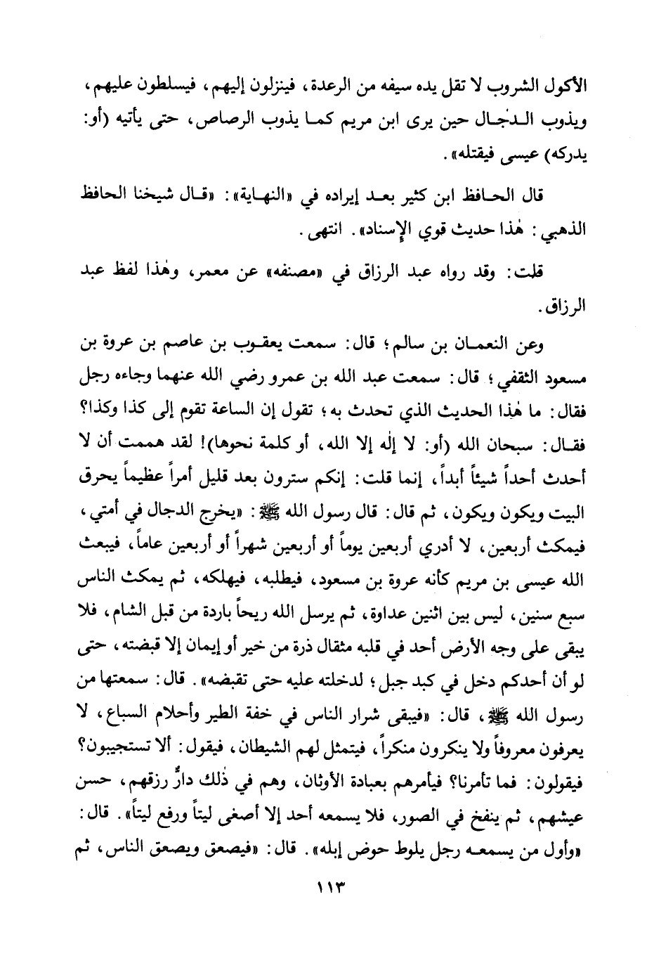 وعن النعمان بن سالم؛ قال: سمعت يعقوب بن عاصم بن عروة بن مسعود الثقفي؛ قال: سمعت عبد الله بن عمرو رضي الله عنهما وجاءه رجل فقال: ما هذا الحديث الذي تحدث به؛ تقول إن الساعة تقوم إلى كذا وكذا؟ فقال: سبحان الله (أو: لا إله إلا الله، أو كلمة نحوها) ! لقد هممت أن لا أحدث أحدا شيا أبدا، إنما قلت: إنكم سترون بعد قليل أمرا عظيما يحرق البيت ويكون ويكون، ثم قال: قال رسول الله صلى الله عليه وسلم: «يخرج الدجال في أمتي، فيمكث أربعين، لا أدري أربعين يوما أو أربعين شهرا أو أربعين عاما، فيبعث الله عيسى ابن مريم كأنه عروة بن مسعود، فيطلبه، فيهلكه، ثم يمكث الناس سبع سنين، ليس بين اثنين عداوة، ثم يرسل الله ريحا باردة من قبل الشام، فلا يبقى على وجه الأرض أحد في قلبه مثقال ذرة من خير أو إيمان إلا قبضته، حتى لو أن أحدكم دخل في كبد جبل؛ لدخلته عليه حتى تقبضه". قال: سمعتها من رسول الله صلى الله عليه وسلم، قال: "فيبقى شرار الناس في خفة الطير وأحلام السباع، لا يعرفون معروفا ولا ينكرون منكرا، فيتمثل لهم الشيطان، فيقول: ألا تستجيبون؟ فيقولون: فما تأمرنا؟ فيأمرهم بعبادة الأوثان، وهم في ذلك دارٌّ رزقهم، حسن عيشهم، ثم ينفخ في الصور، فلا يسمعه أحد إلا أصغى ليتا ورفع ليتا". قال: "وأول من يسمعه رجل يلوط حوض إبله". قال: "فيصعق ويصعق الناس، ثم»