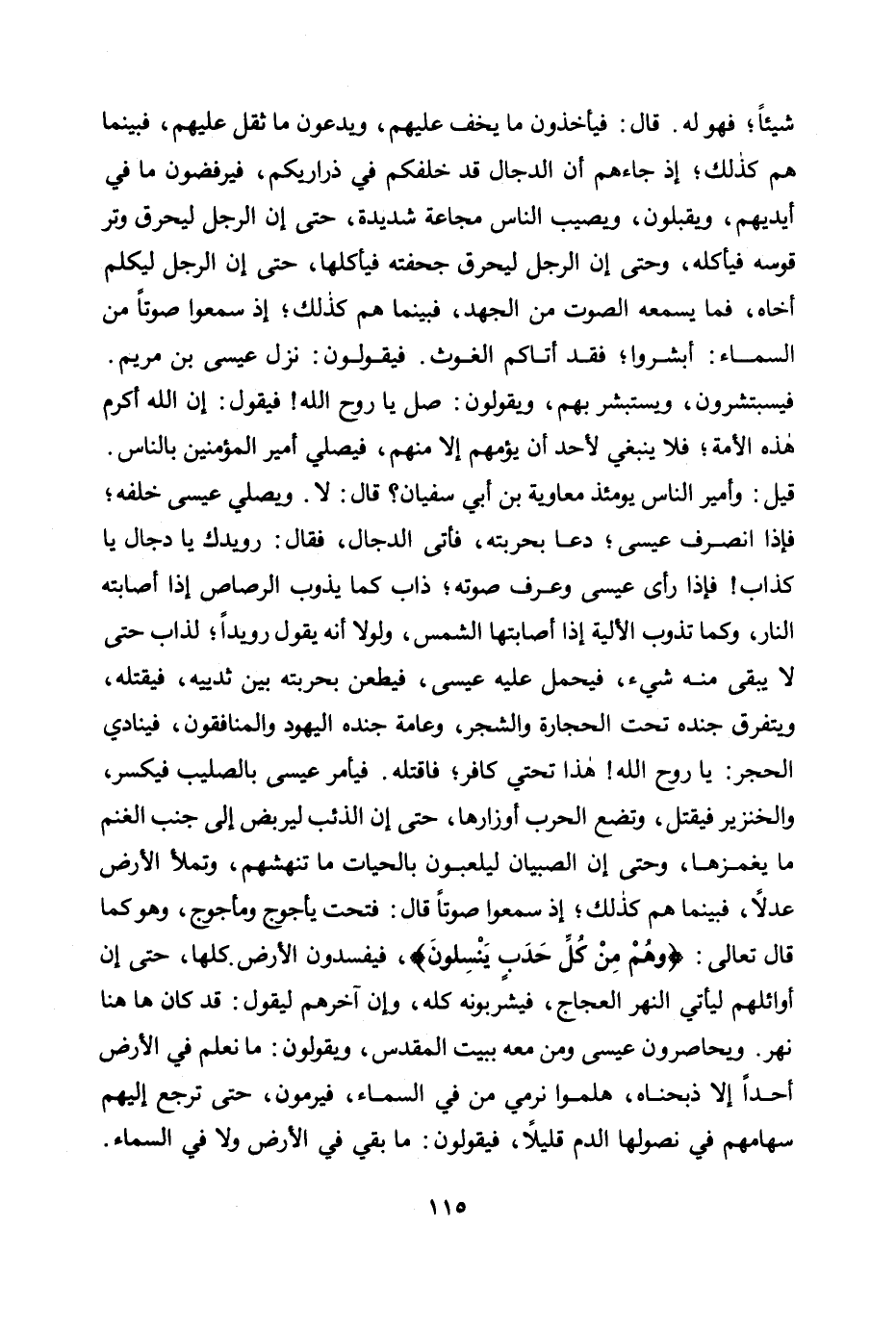 قيل: وأمير الناس يومئذ معاوية بن أبي سفيان؟ قال: لا. ويصلي عيسى خلفه؛ فإذا انصرف عيسى؛ دعا بحربته، فأتى الدجال، فقال: رويدك يا دجال يا كذاب! فإذا رأى عيسى وعرف صوته؛ ذاب كما يذوب الرصاص إذا أصابته النار، وكما تذوب الألية إذا أصابتها الشمس، ولولا أنه يقول رويدا؛ لذاب حتى لا يبقى منه شيء، فيحمل عليه عيسى، فيطعن بحربته بين ثدييه، فيقتله، ويتفرق جنده تحت الحجارة والشجر، وعامة جنده اليهود والمنافقون، فينادي الحجر: يا روح الله! هذا تحتي كافر؛ فاقتله. فيأمر عيسى بالصليب فيكسر، والخنزير فيقتل، وتضع الحرب أوزارها، حتى إن الذئب ليربض إلى جنب الغنم ما يغمزها، وحتى إن الصبيان ليلعبون بالحيات ما تنهشهم، وتملأ الأرض عدلا، فبينما هم كذلك؛ إذ سمعوا صوتا قال: فتحت يأجوج ومأجوج، وهو كما قال تعالى: {وَهُمْ مِنْ كُلِّ حَدَبٍ يَنْسِلُونَ} ، فيفسدون الأرض كلها، حتى إن أوائلهم ليأتي النهر العجاج، فيشربونه كله، وإن آخرهم ليقول: قد كان هاهنا نهر. ويحاصرون عيسى ومن معه ببيت المقدس، ويقولون: ما نعلم في الأرض أحدا إلا ذبحناه، هلموا نرمي من في السماء، فيرمون، حتى ترجع إليهم سهامهم في نصولها الدم قليلا، فيقولون: ما بقي في الأرض ولا في السماء.