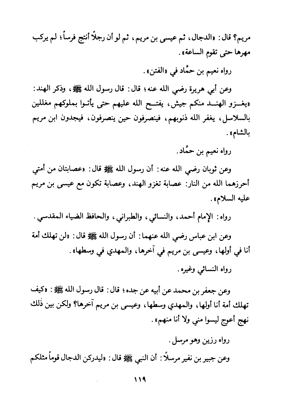 وعن ثوبان رضي الله عنه: أن رسول الله صلى الله عليه وسلم قال: «عصابتان من أمتي أحرزهما الله من النار: عصابة تغزو الهند، وعصابة تكون مع عيسى ابن مريم عليه السلام» .