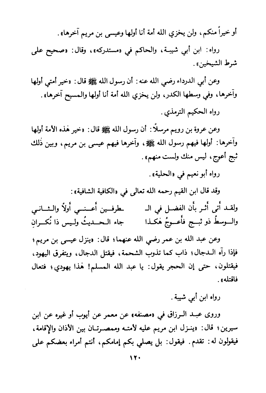 وعن أبي الدرداء رضي الله عنه: أن رسول الله صلى الله عليه وسلم قال: «خير أمتي أولها وآخرها، وفي وسطها الكدر، ولن يخزي الله أمة أنا أولها والمسيح آخرها» .