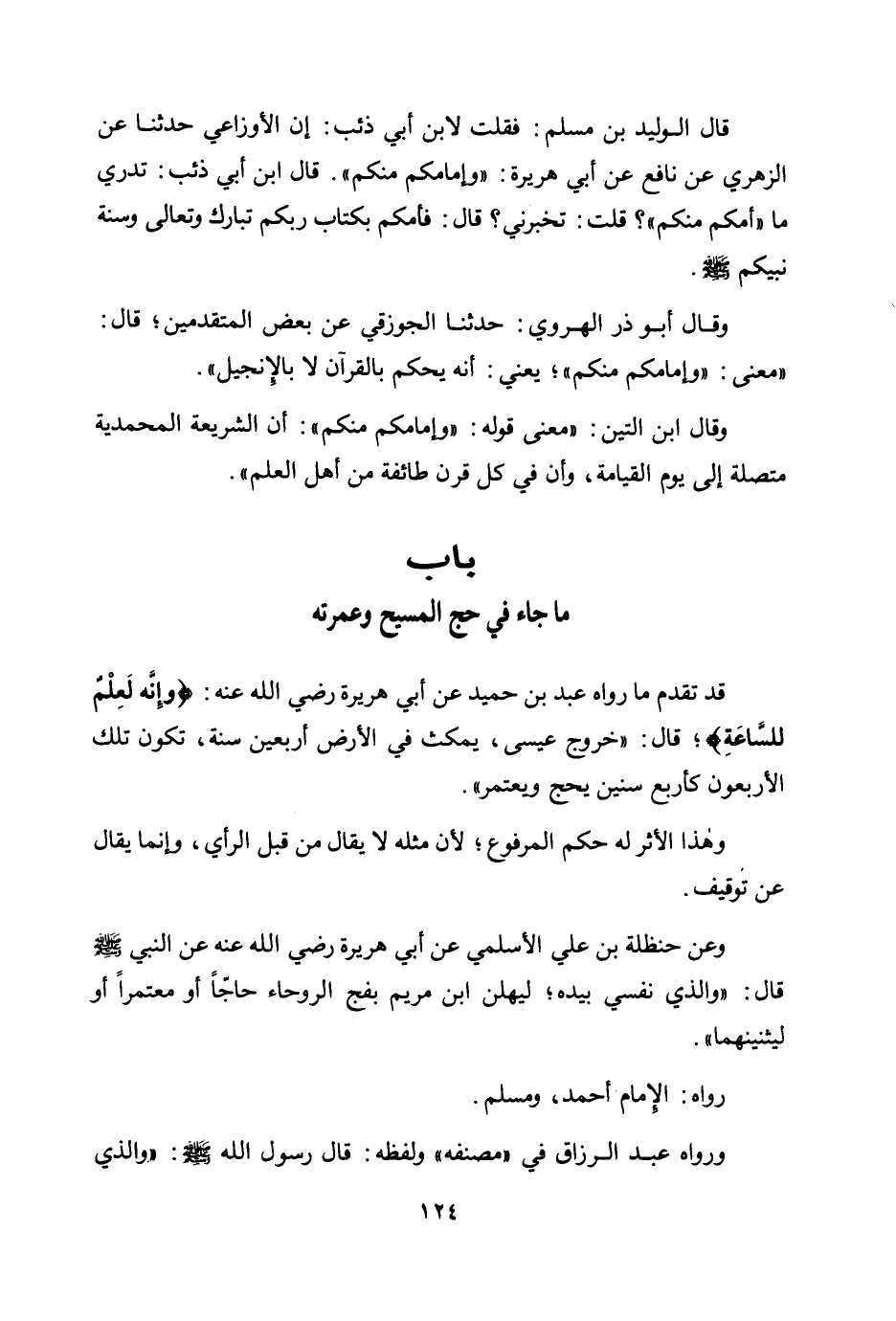 وعن حنظلة بن علي الأسلمي عن أبي هريرة رضي الله عنه عن النبي صلى الله عليه وسلم قال: «والذي نفسي بيده؛ ليهلن ابن مريم بفج الروحاء حاجا أو معتمرا أو ليثنينهما» .