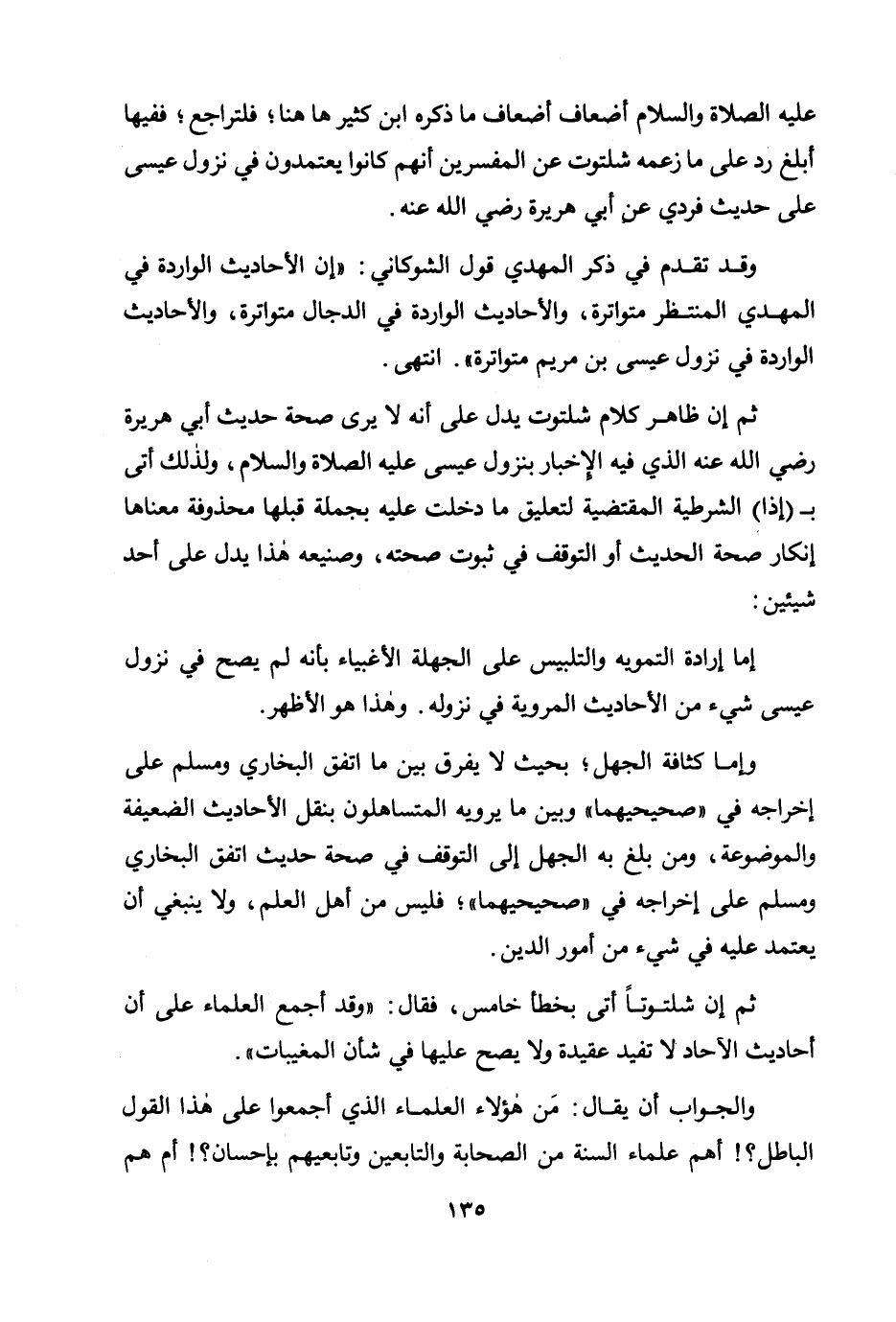 عليه الصلاة والسلام أضعاف أضعاف ما ذكره ابن كثير هاهنا؛ فلتراجع؛ ففيها أبلغ رد على ما زعمه شلتوت عن المفسرين أنهم كانوا يعتمدون في نزول عيسى على حديث فردي عن أبي هريرة رضي الله عنه.