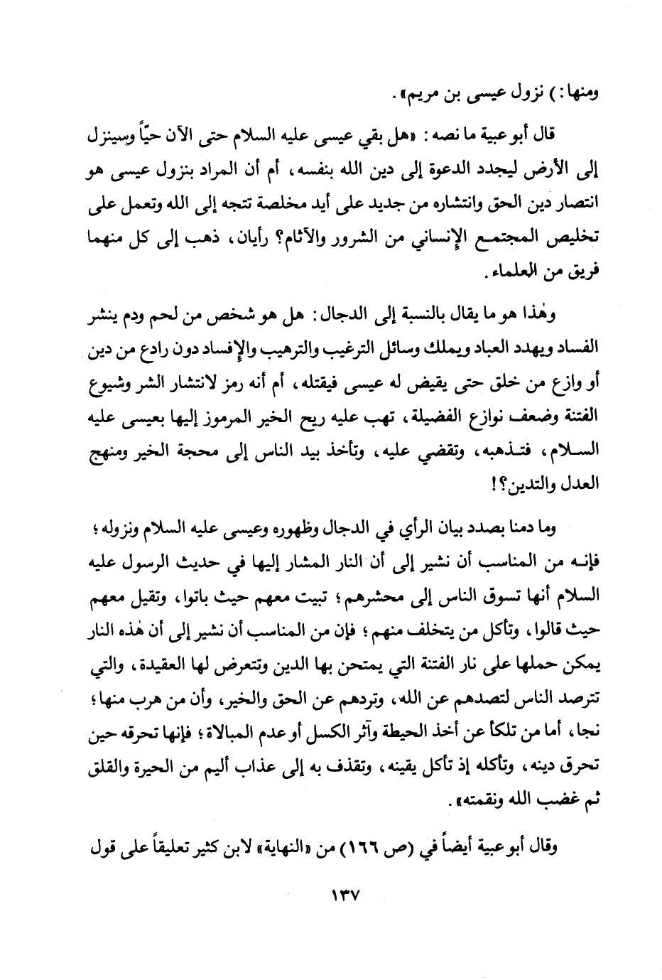 قال أبو عبية ما نصه: "هل بقي عيسى عليه السلام حتى الآن حيا وسينزل إلى الأرض ليجدد الدعوة إلى دين الله بنفسه، أم أن المراد بنزول عيسى هو انتصار دين الحق وانتشاره من جديد على أيد مخلصة تتجه إلى الله وتعمل على تخليص المجتمع الإنساني من الشرور والآثام؟ رأيان، ذهب إلى كل منهما فريق من العلماء.
