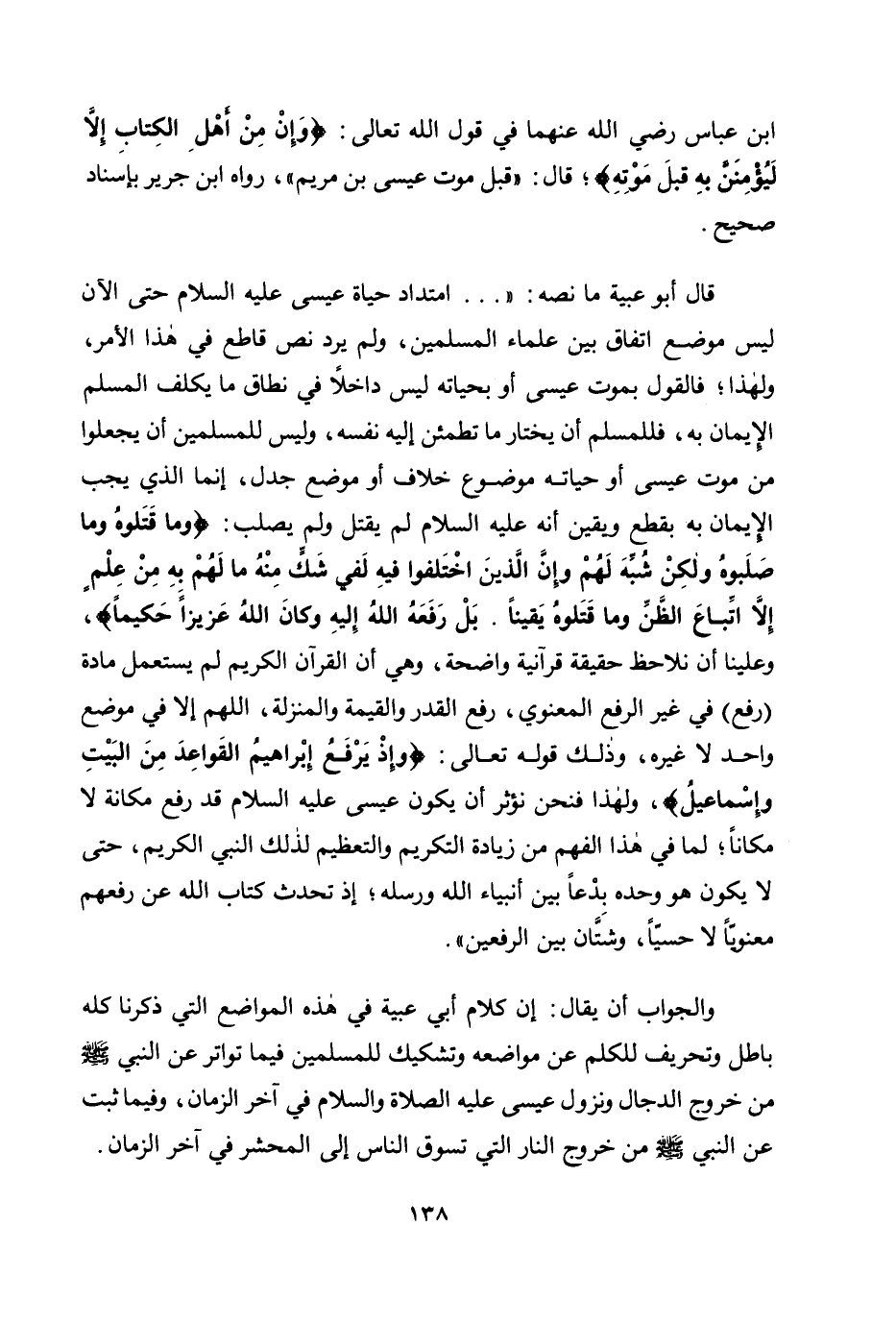 ابن عباس رضي الله عنهما في قول الله تعالى: {وَإِنْ مِنْ أَهْلِ الْكِتَابِ إِلَّا لَيُؤْمِنَنَّ بِهِ قَبْلَ مَوْتِهِ} ؛ قال: "قبل موت عيسى ابن مريم "، رواه ابن جرير بإسناد صحيح.