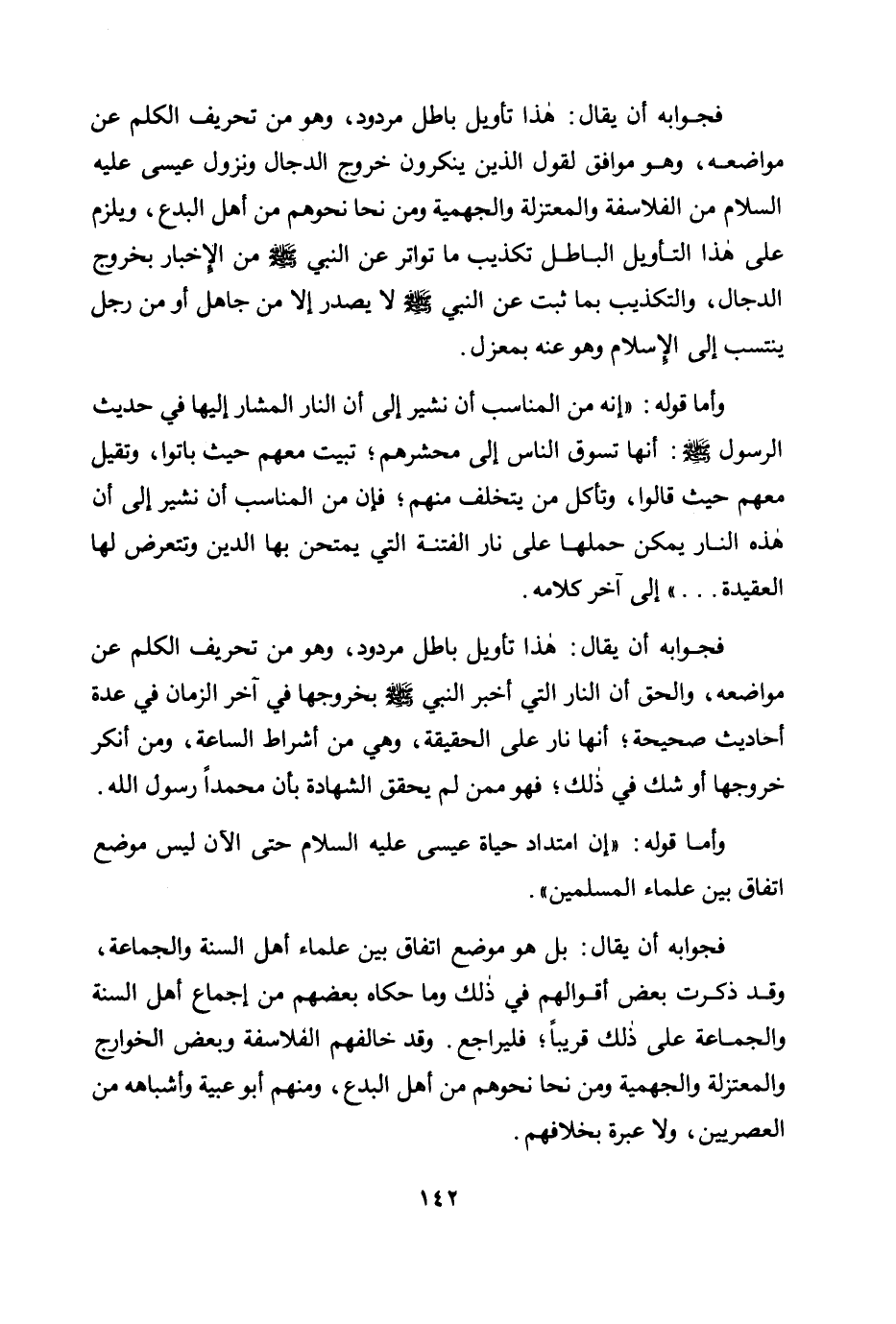 فجوابه أن يقال: هذا تأويل باطل مردود، وهو من تحريف الكلم عن مواضعه، وهو موافق لقول الذين ينكرون خروج الدجال ونزول عيسى عليه السلام من الفلاسفة والمعتزلة والجهمية ومن نحا نحوهم من أهل البدع، ويلزم على هذا التأويل الباطل تكذيب ما تواتر عن النبي صلى الله عليه وسلم من الإخبار بخروج الدجال، والتكذيب بما ثبت عن النبي صلى الله عليه وسلم لا يصدر إلا من جاهل أو من رجل ينتسب إلى الإسلام وهو عنه بمعزل.