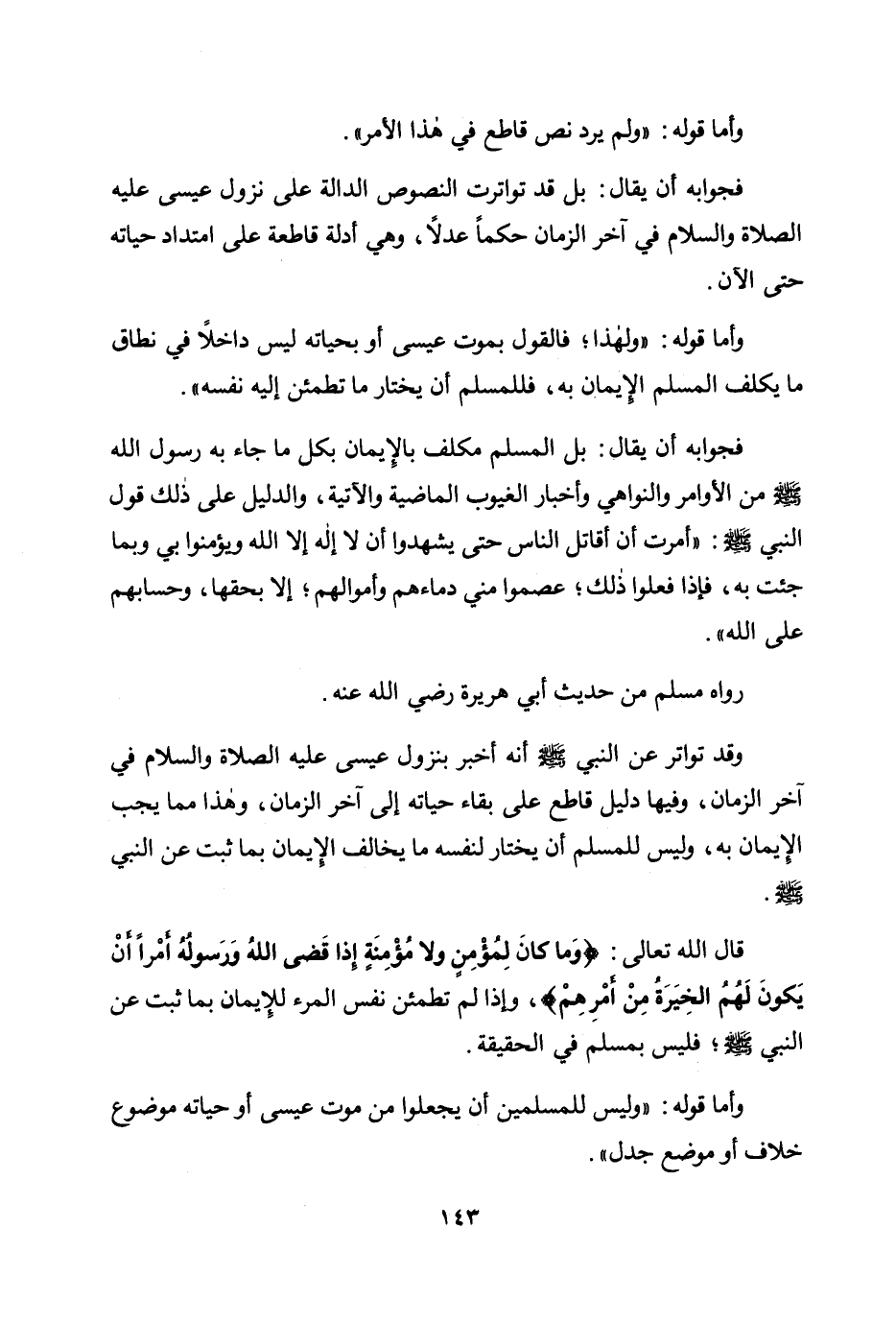 فجوابه أن يقال: بل قد تواترت النصوص الدالة على نزول عيسى عليه الصلاة والسلام في آخر الزمان حكما عدلا، وهي أدلة قاطعة على امتداد حياته حتى الآن.